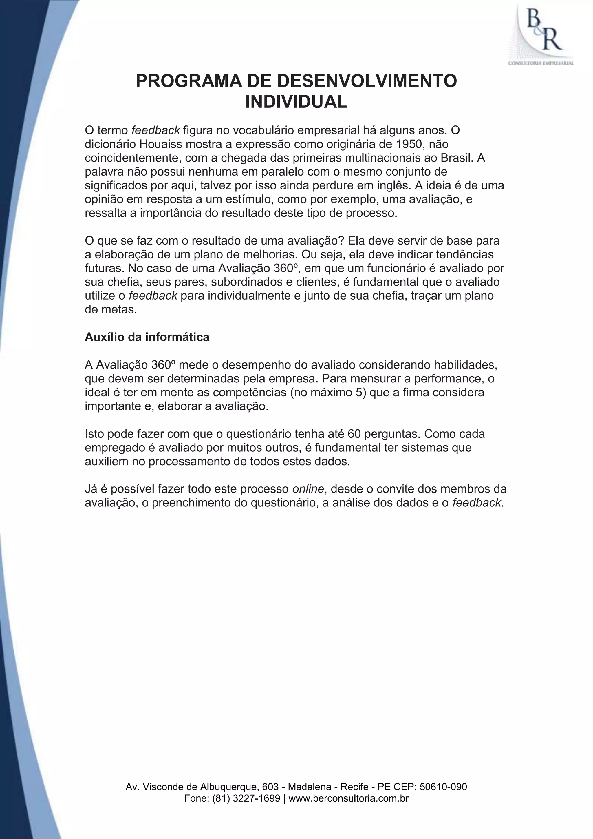 O documento discute um programa de desenvolvimento individual baseado em avaliações de feedback de 360 graus. Ele descreve como o feedback deve ser usado para elaborar um plano de melhoria individual e metas com a chefia. Também destaca a importância de sistemas de informática para processar os dados de avaliação de múltiplos avaliadores.