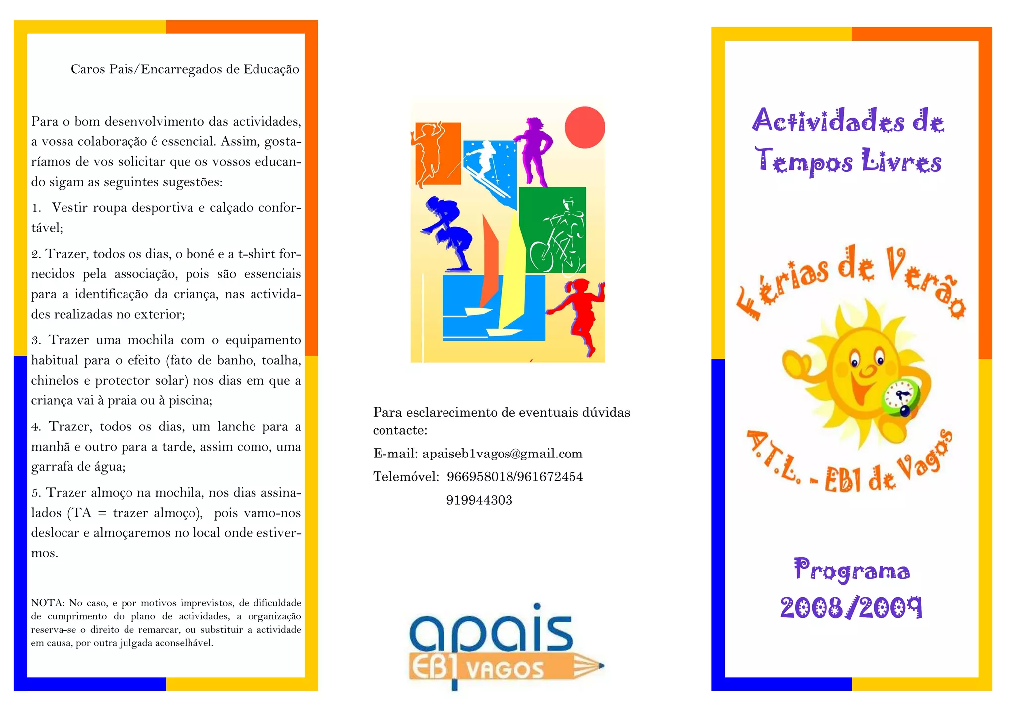 Este documento apresenta um programa de atividades de tempos livres para crianças durante o verão. Solicita a colaboração dos pais com 10€ e fornece instruções sobre o que as crianças devem trazer para as atividades. O programa inclui visitas a praias, museus, piscinas e outras atividades educativas e de lazer.