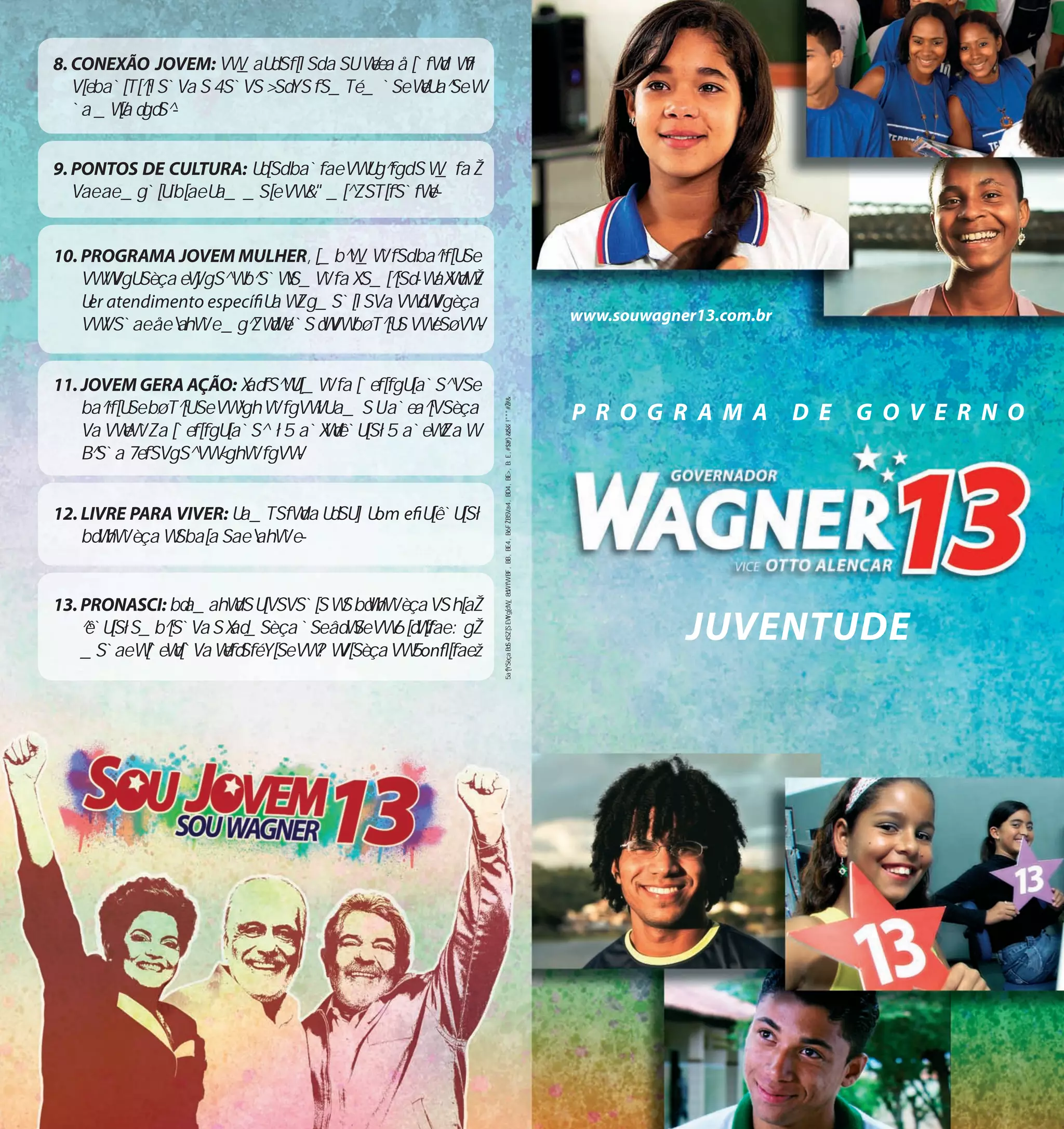 O documento descreve sete programas do governo Wagner para apoiar a juventude baiana: 1) Educação profissional, 2) Acesso à universidade, 3) Trabalho decente, 4) Programa de qualificação Trilha, 5) Envolvimento dos jovens na Copa de 2014 e Olimpíadas, 6) Novos espaços de lazer, esporte e cultura, 7) Centros de referência para os jovens. O objetivo é elevar a qualidade de vida dos jovens e torná-los protagonistas do desenvolvimento da Bahia.