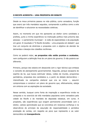 O documento apresenta uma proposta de plano de governo para a cidade do Recife. Ele descreve a visão da candidata para a cidade, enfatizando que o Recife é singular em suas memórias e afetos, mas também plural e diverso. O documento traz diretrizes gerais e estrutura temática para áreas como gestão, mobilidade, saúde e habitação. A candidata também apresenta sua experiência política.