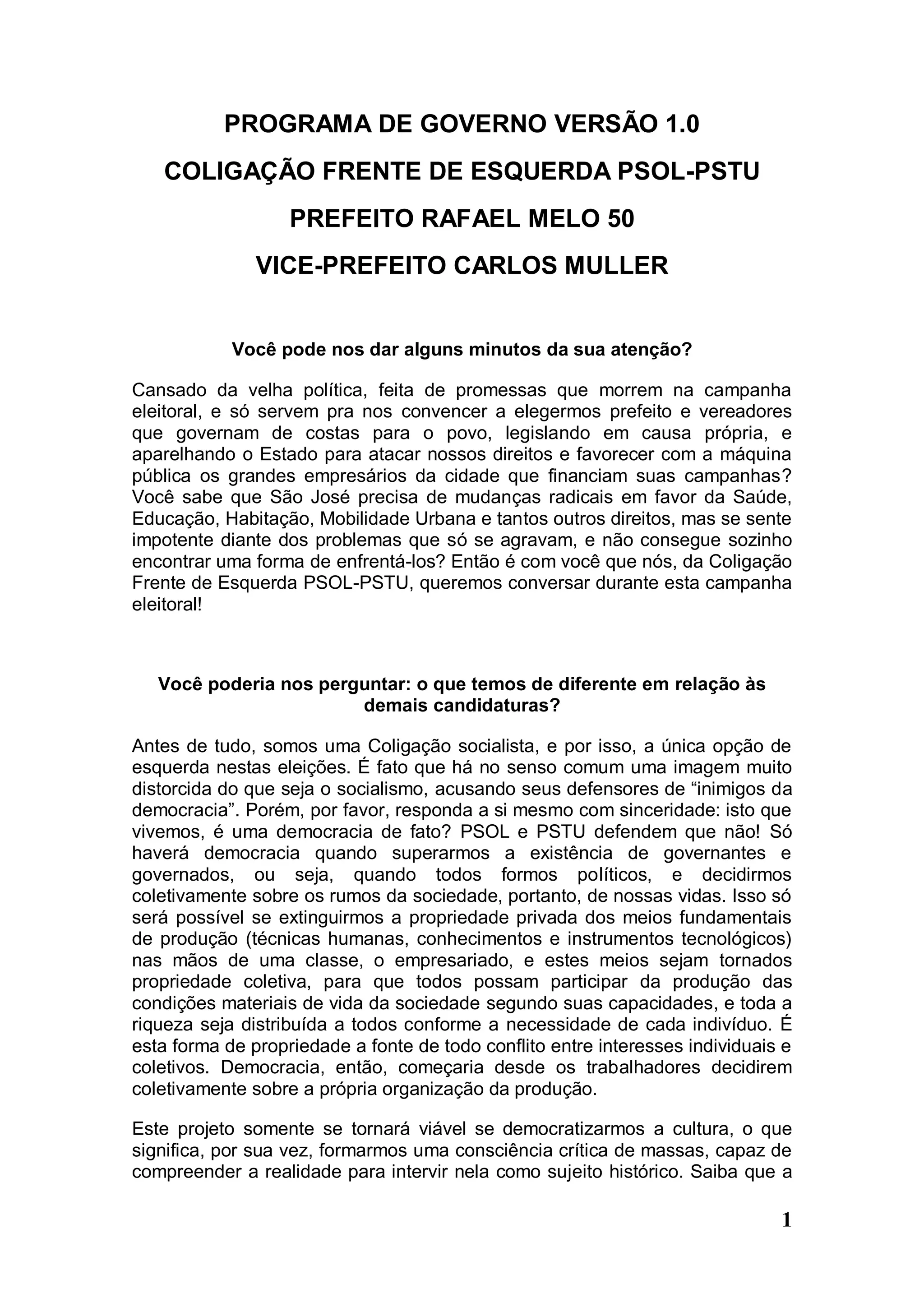 Este documento apresenta as propostas da Coligação Frente de Esquerda PSOL-PSTU para as eleições municipais. Criticam a "velha política" praticada pelos outros candidatos e propõem uma alternativa socialista, defendendo a democracia no local de trabalho e a propriedade coletiva dos meios de produção. Argumentam que o capitalismo gera desigualdade social e que o Estado atualmente só administra essa desigualdade sem enfrentar suas causas estruturais.