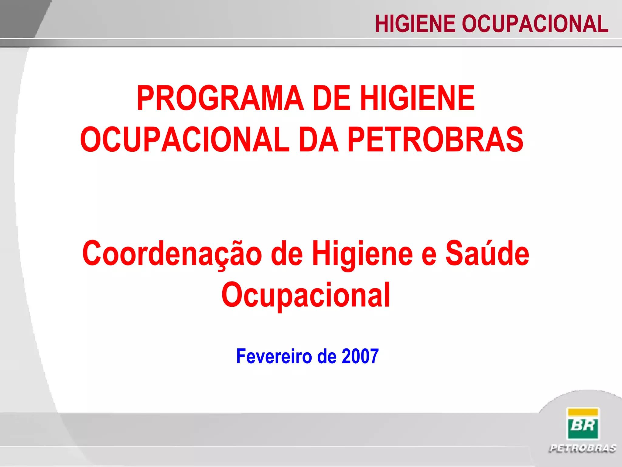 O documento descreve o Programa de Higiene Ocupacional da Petrobras, com o objetivo de assegurar ambientes de trabalho saudáveis e prevenir doenças ocupacionais. Ele apresenta a estratégia da empresa até 2015, incluindo a sistematização da gestão de riscos à saúde, capacitação de profissionais, informatização da gestão e assessoria/acompanhamento das atividades de higiene ocupacional.