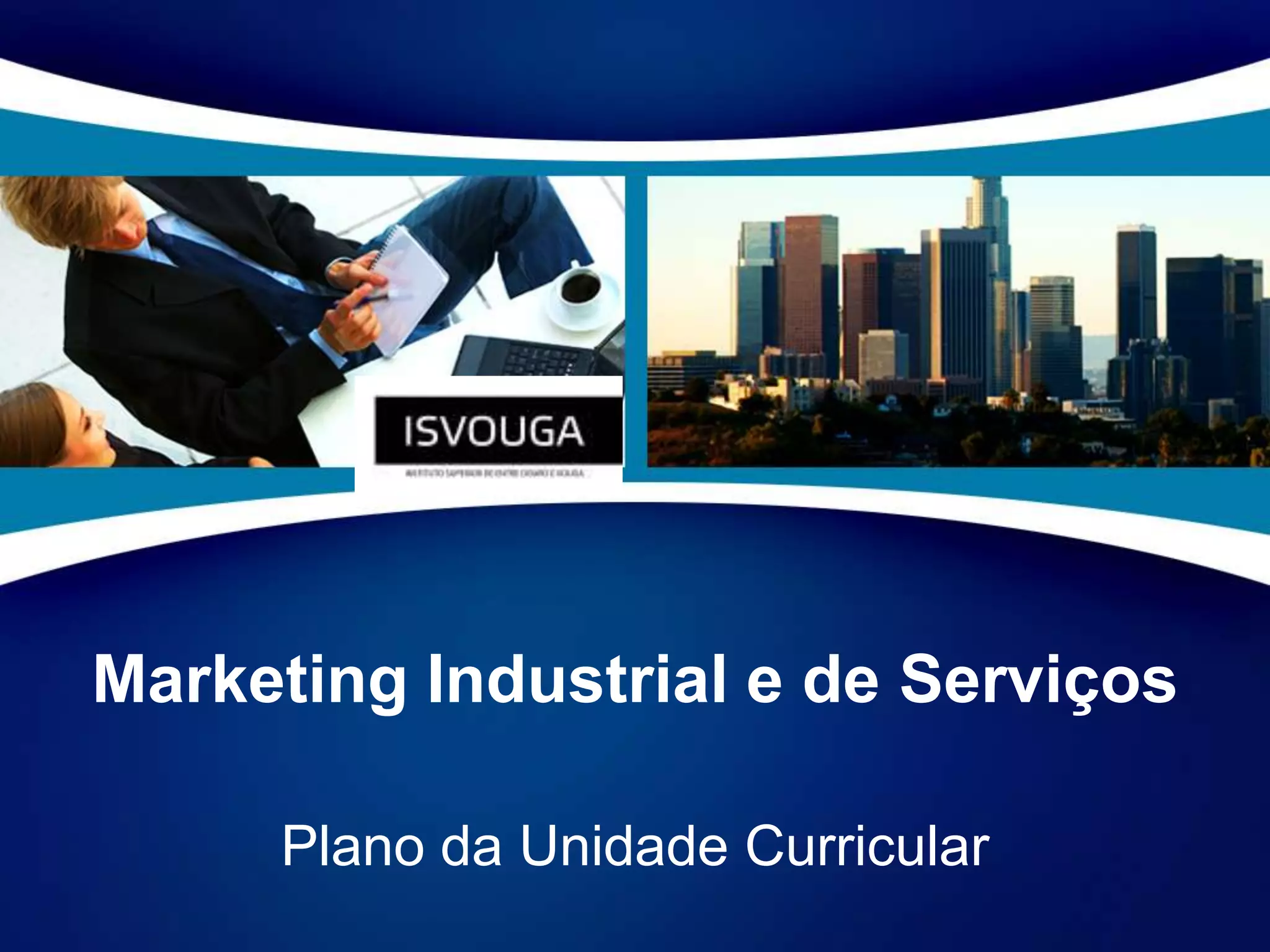 Este documento apresenta o plano de uma unidade curricular de Marketing Industrial e de Serviços. O objetivo geral é analisar o marketing na indústria e nos serviços, com objetivos específicos como combinar as fases do planeamento de marketing e representar o processo de criação de serviços. A metodologia inclui aulas teóricas e práticas com estudo de casos e avaliação baseada em testes e participação.