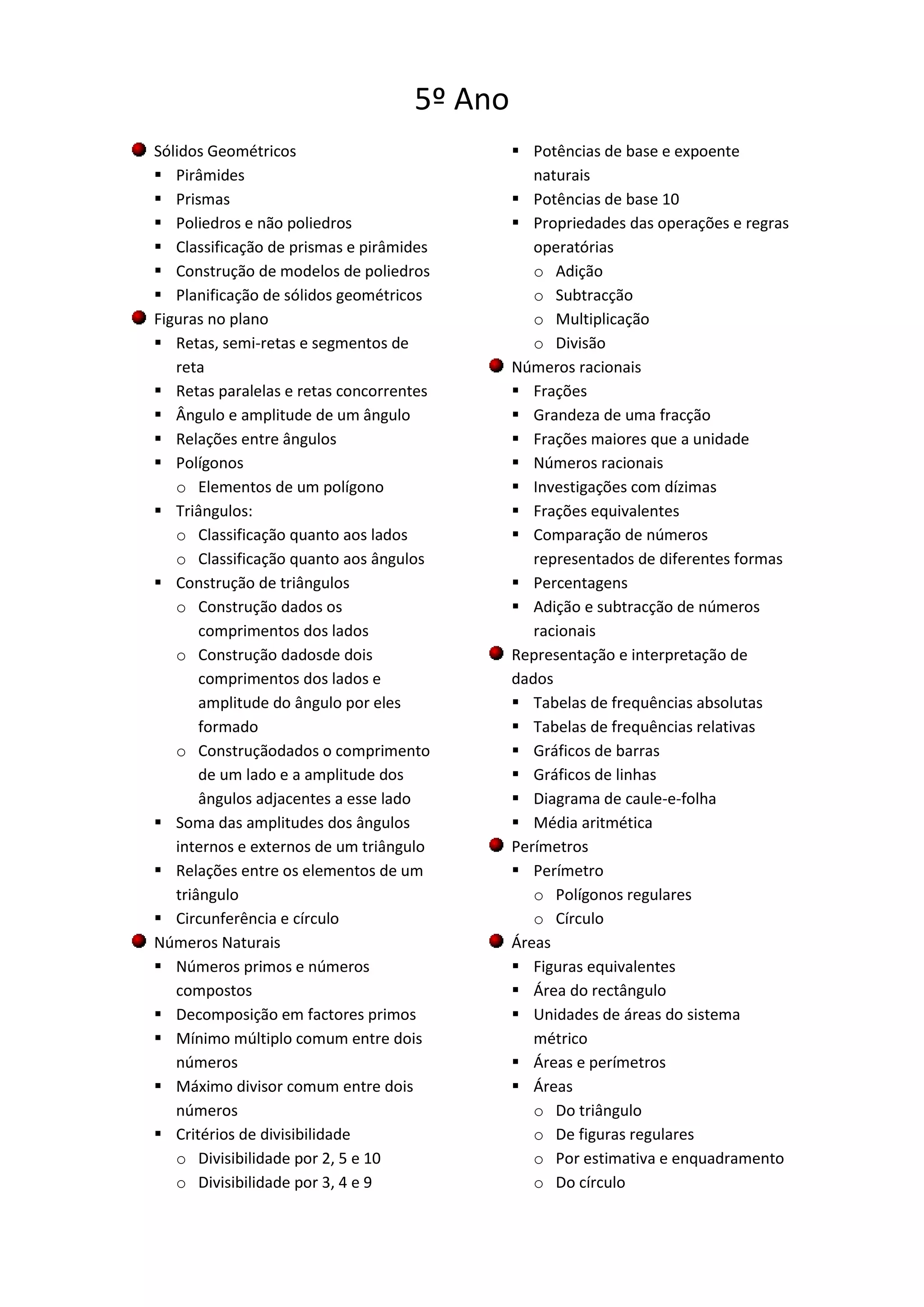 Este documento apresenta os tópicos que serão abordados nos 5o e 6o anos de escolaridade em matemática. No 5o ano, os alunos estudarão sólidos geométricos, figuras no plano, números naturais, racionais e representação de dados. No 6o ano, serão estudadas isometrias, volumes, números inteiros e relações entre números.
