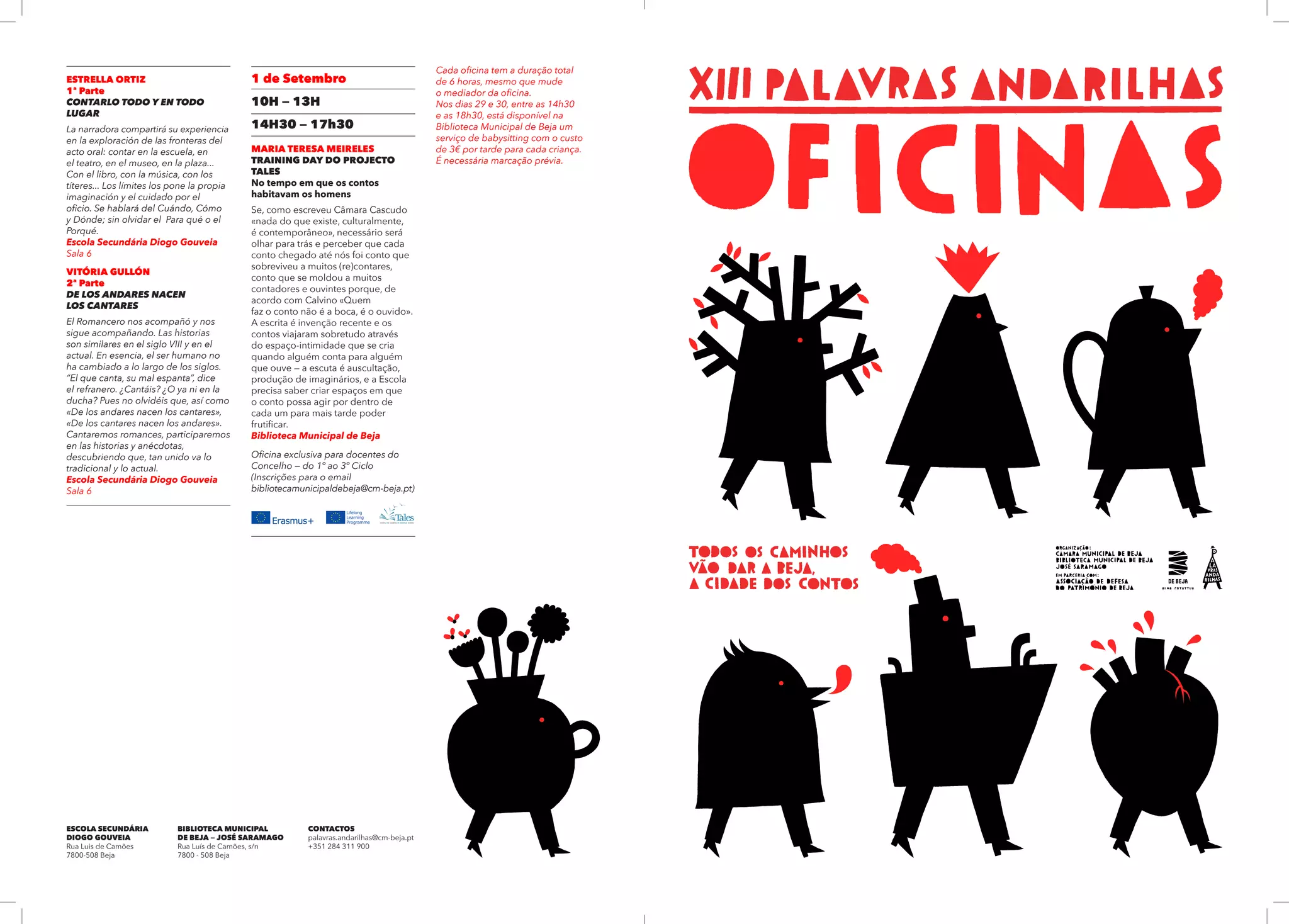1) O documento descreve uma série de oficinas sobre contos, literatura infantil e mediação de leitura a serem realizadas em Beja, Portugal.