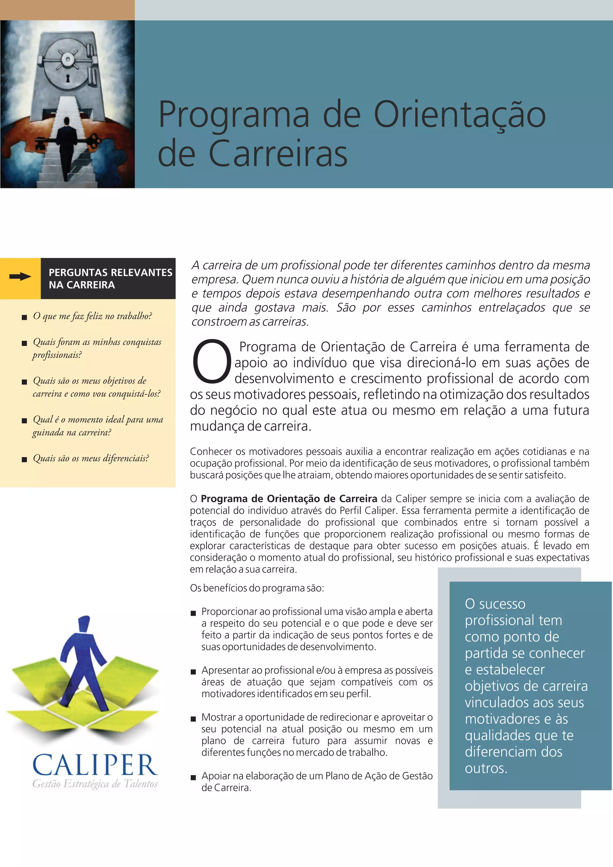 O documento descreve um Programa de Orientação de Carreira que auxilia profissionais a entenderem seus pontos fortes e motivadores pessoais para identificar caminhos de sucesso na carreira. O programa utiliza o Perfil Caliper para avaliar a personalidade do indivíduo e sugere um Plano de Ação com objetivos e metas para aproveitar seu potencial na posição atual ou em novas funções.