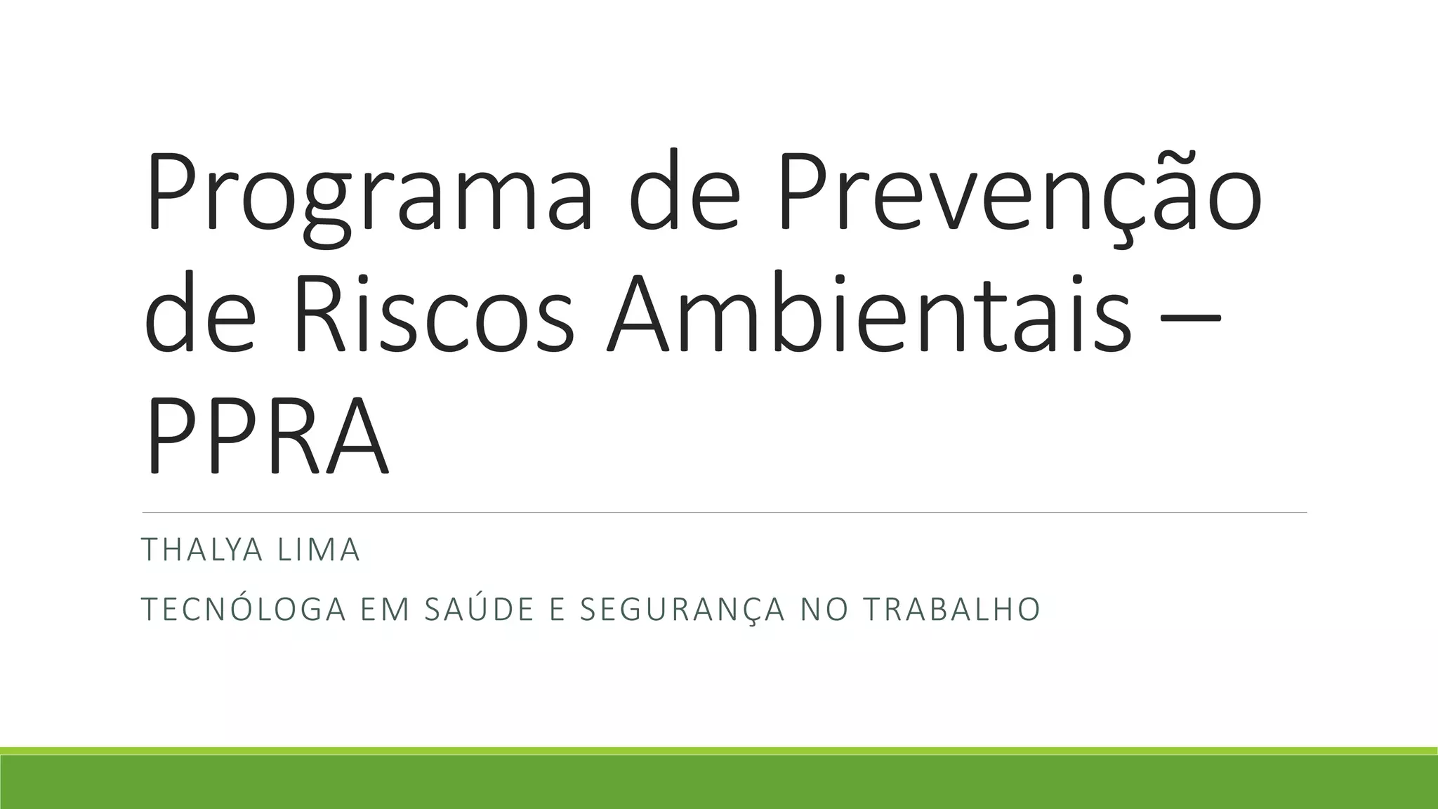 O documento descreve o Programa de Prevenção de Riscos Ambientais (PPRA), que tem como objetivo identificar, avaliar e controlar riscos ambientais no ambiente de trabalho, preservando a saúde dos trabalhadores. O PPRA deve ser implementado por todos os empregadores e inclui etapas de antecipação, reconhecimento, avaliação e controle de riscos ambientais como agentes físicos, químicos e biológicos. O documento também descreve a estrutura e desenvolvimento adequados para o PPRA.