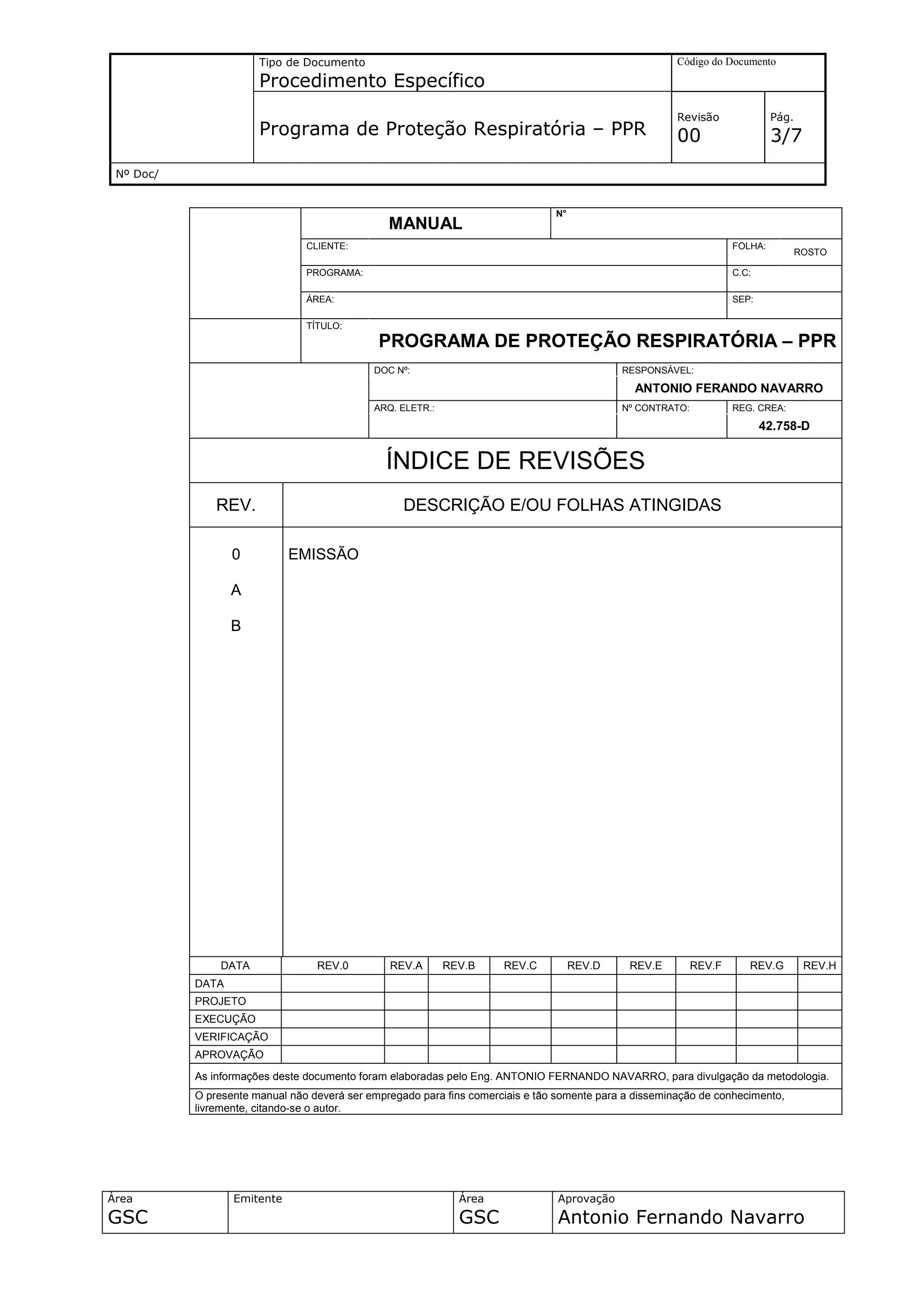 Este documento descreve um Programa de Proteção Respiratória (PPR) que estabelece controles para proteger a saúde dos trabalhadores expostos a agentes respiráveis nocivos. O PPR define responsabilidades, requisitos de treinamento, seleção e uso correto de equipamentos de proteção respiratória, e manutenção dos mesmos.