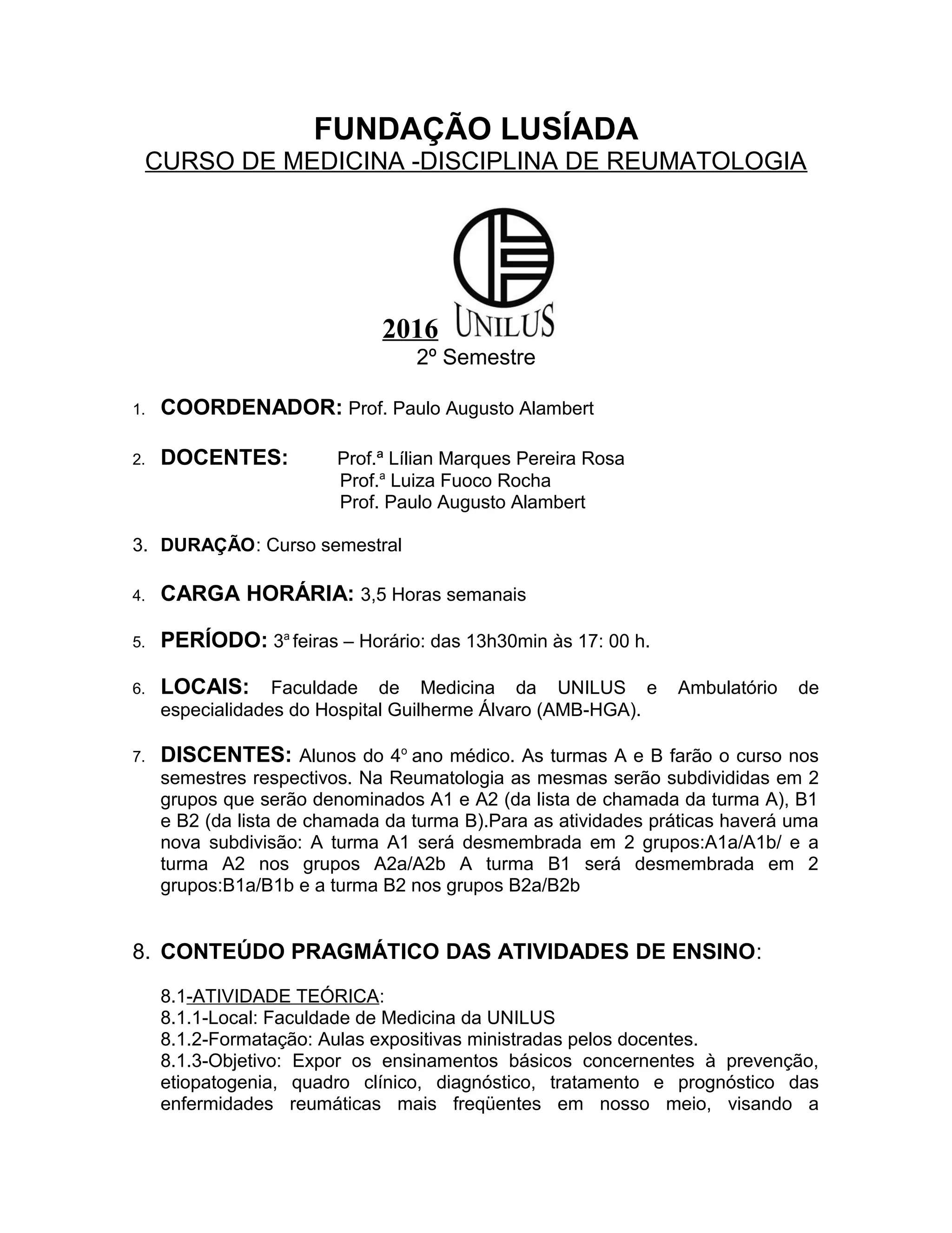 Este documento descreve o curso de Reumatologia para alunos do 4o ano de medicina, incluindo professores, duração, carga horária, locais, alunos, conteúdo das aulas teóricas e práticas, e programação das atividades para o semestre.