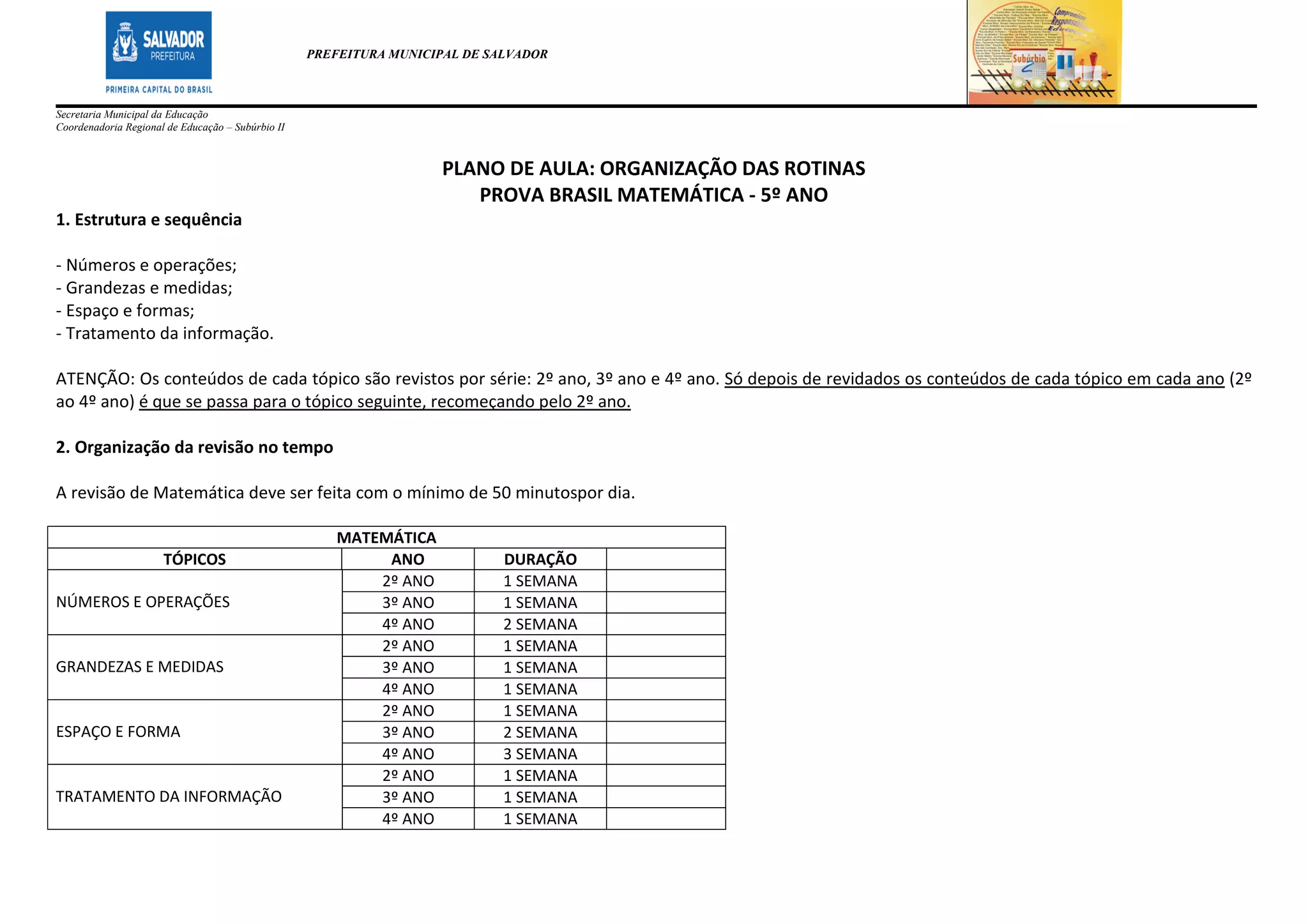 O documento apresenta o plano de aula para revisão de Matemática dos 2o, 3o e 4o anos com foco nos tópicos de Números e Operações, Grandezas e Medidas, Espaço e Formas e Tratamento da Informação. O plano inclui a estruturação dos conteúdos por série, a organização do tempo de revisão, a aplicação de testes diagnósticos e avaliativos e os materiais a serem utilizados.
