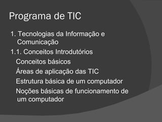 O documento descreve um programa de Tecnologias da Informação e Comunicação (TIC) que inclui conceitos introdutórios sobre TIC, sistemas operacionais gráficos, internet e aplicações como processamento de texto e criação de apresentações.