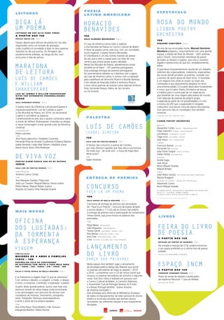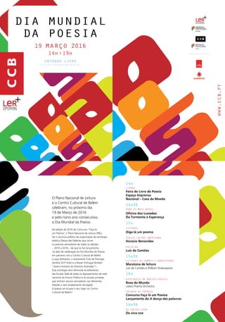 O documento descreve os eventos que ocorrerão no Centro Cultural de Belém em Lisboa no Dia Mundial da Poesia em 19 de março de 2016, incluindo leituras, oficinas, lançamento de livros e apresentações de poetas. O dia celebra a poesia de 14h às 19h com diversas atividades culturais gratuitas em torno da temática.