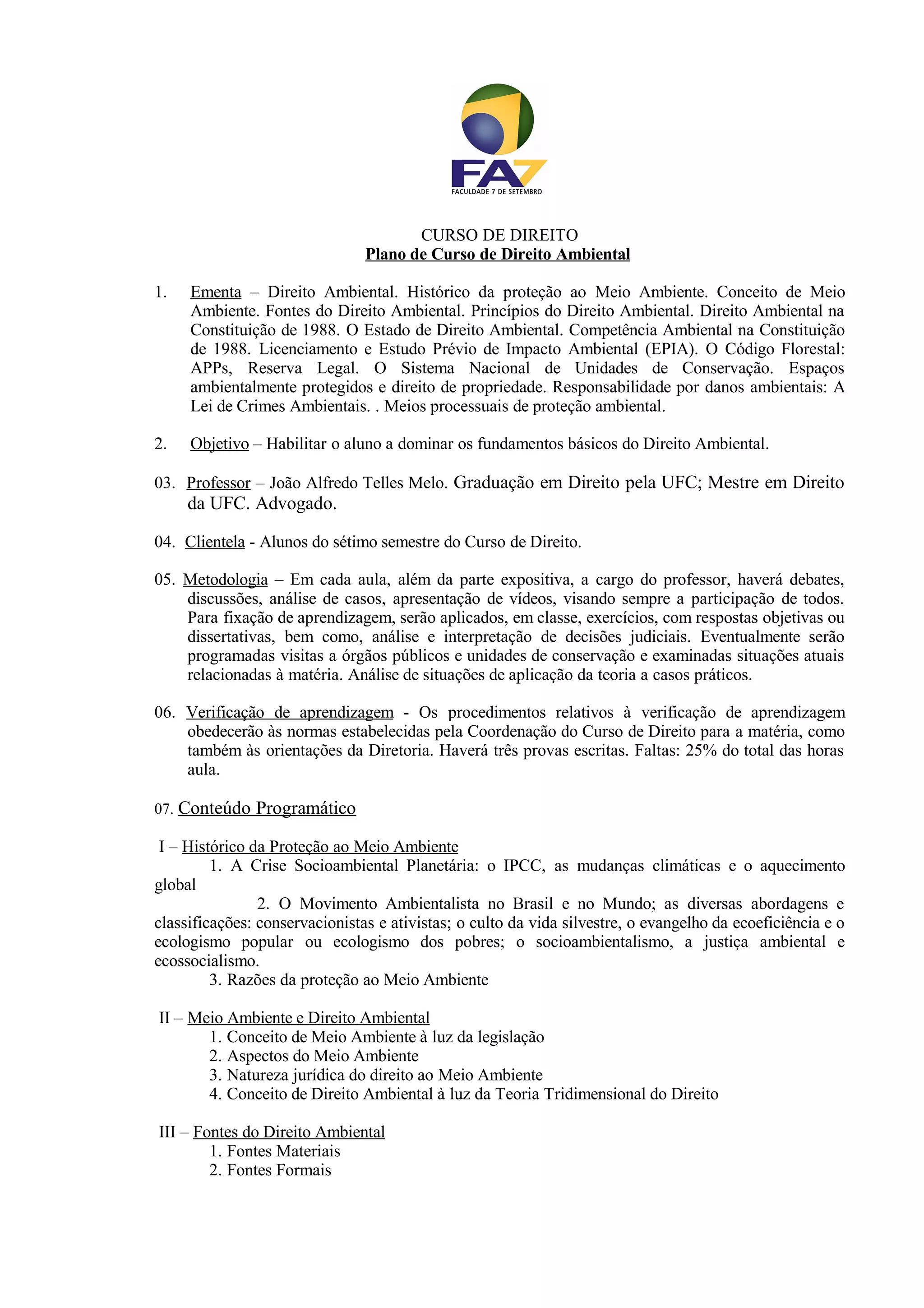 Este plano de curso descreve um curso de Direito Ambiental ministrado para alunos do sétimo semestre de Direito. O curso tem como objetivo habilitar os alunos nos fundamentos básicos do Direito Ambiental e abordará tópicos como a história da proteção ambiental, princípios e fontes do Direito Ambiental, meio ambiente e direito constitucional, licenciamento ambiental, unidades de conservação, responsabilidade por danos ambientais e meios de proteção ambiental.
