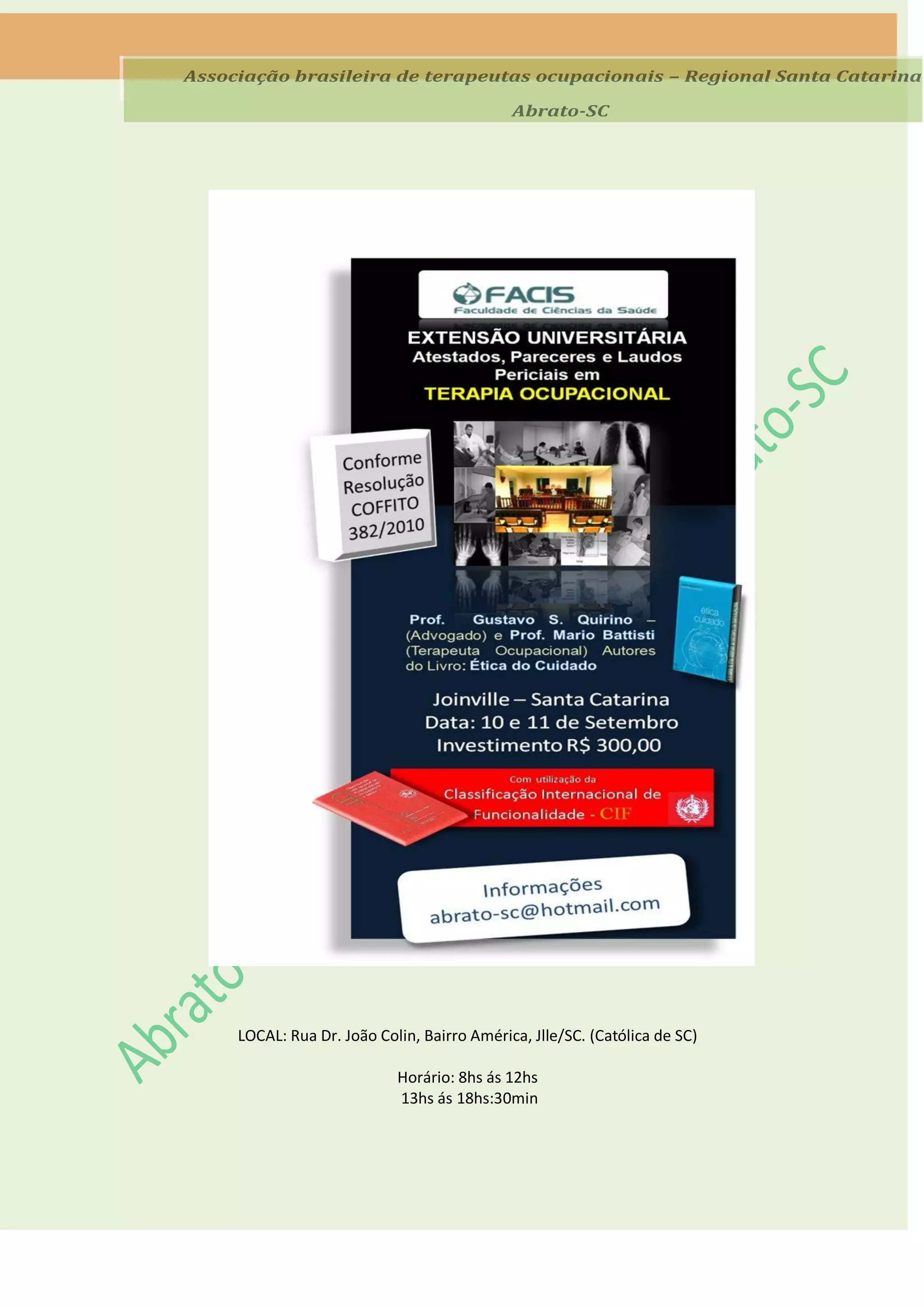 O documento apresenta o programa de um curso de extensão sobre atestados, pareceres e laudos em terapia ocupacional oferecido pela Associação Brasileira de Terapeutas Ocupacionais da região de Santa Catarina. O curso abordará fundamentos do direito, o ambiente judiciário, o processo judicial, a atuação do perito judicial e fundamentos em terapia ocupacional. Além disso, sugere hotéis em Joinville para os participantes do curso.