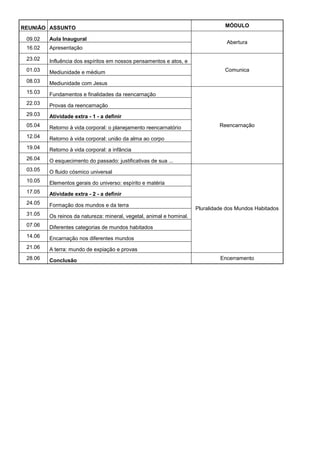 O documento apresenta o cronograma de uma série de aulas sobre espiritualidade e mediunidade. As aulas abordarão tópicos como a influência dos espíritos, reencarnação, o fluido cósmico universal, a formação da Terra e dos mundos, e os diferentes reinos da natureza.