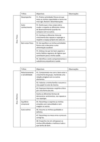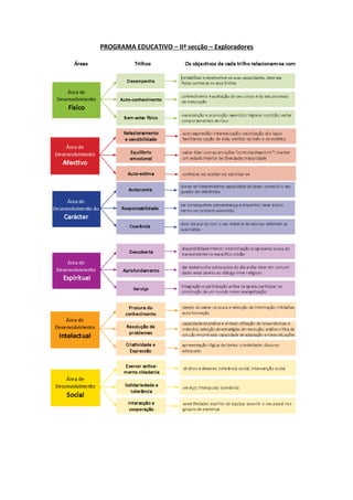 O documento apresenta um programa educativo para exploradores com objetivos em 8 áreas: física, afetiva, caráter, espiritual, intelectual, social. Cada área inclui trilhos com objetivos para ajudar os exploradores a desenvolver capacidades físicas, emocionais e sociais.