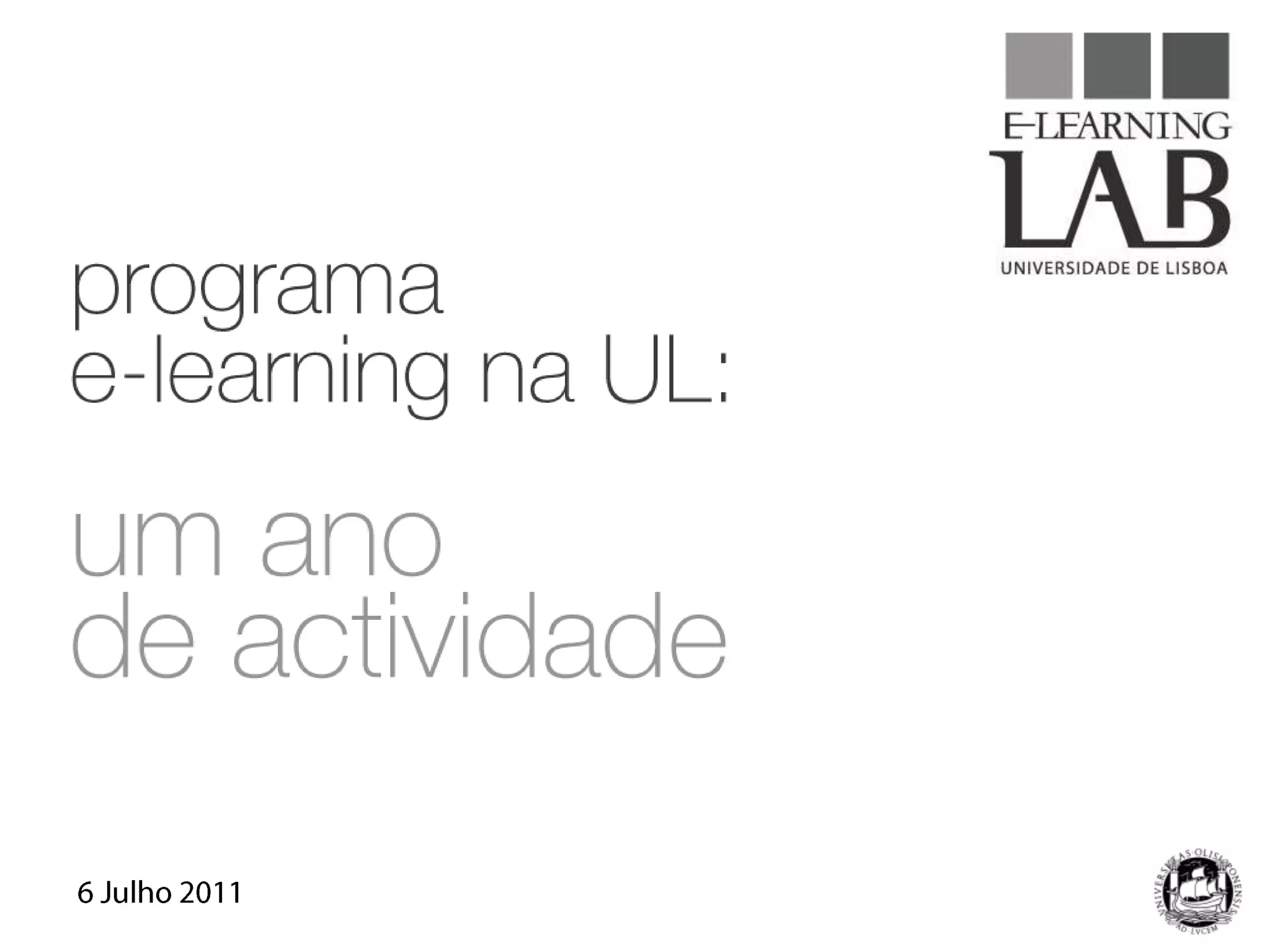 O documento descreve as atividades do programa e-learning na Universidade de Lisboa (UL) durante seu primeiro ano. O programa teve como objetivos desenvolver competências digitais, estimular a oferta de cursos online e promover uma aprendizagem mais flexível. Suas atividades incluíram divulgação, formação, desenvolvimento de sistemas de apoio e monitoramento.