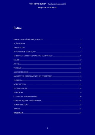 Este documento apresenta as propostas de um partido político para as eleições autárquicas de 2013 no concelho de Mortágua. As principais propostas incluem aumentar o apoio às famílias e à natalidade, promover o emprego e o desenvolvimento econômico local, melhorar os serviços sociais e de saúde, e investir na juventude e educação de forma a reter os jovens no concelho. O documento defende uma gestão orçamental rigorosa e equilibrada.