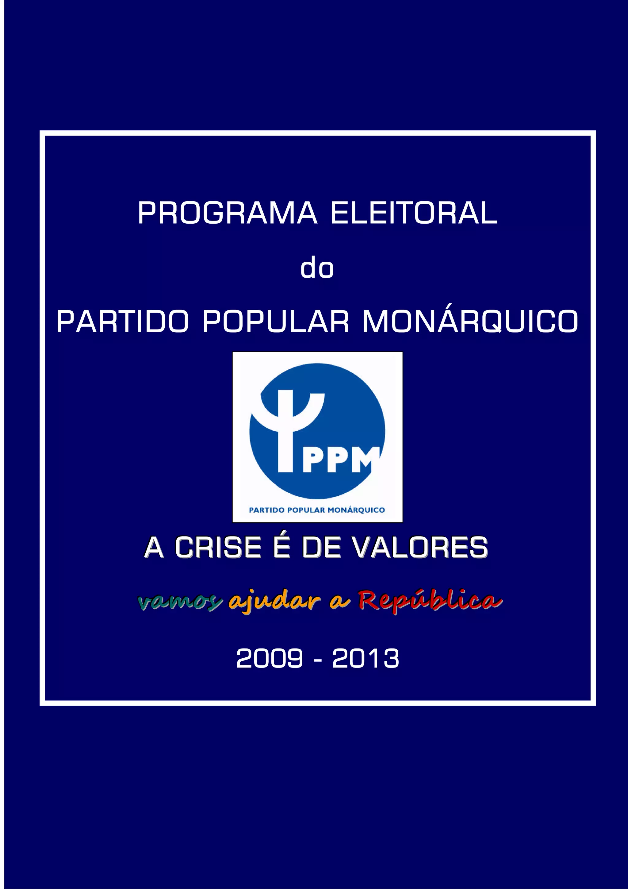 O documento apresenta o programa eleitoral do Partido Popular Monáquico para as eleições legislativas de 2009-2013. O programa defende políticas econômicas, sociais e fiscais para projetar Portugal e combater a crise de valores, com foco em reduzir os custos do estado e apoiar a classe média. O Partido também se opõe ao federalismo europeu e defende uma Europa que coloque Portugal em primeiro lugar.
