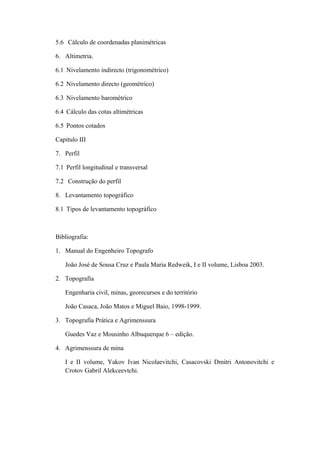 O documento apresenta um programa sobre elementos de topografia, incluindo tópicos como a forma e dimensão da Terra, sistemas de coordenadas, instrumentos topográficos, nivelamento, perfil e levantamento topográfico. O capítulo I discute conceitos como elipsoide, sistemas de projeção e representação gráfica. O capítulo II trata de instrumentos como teodolito, nível e métodos de medição. O capítulo III aborda perfil e tipos de levantamento topográfico. A avaliação inclui requis