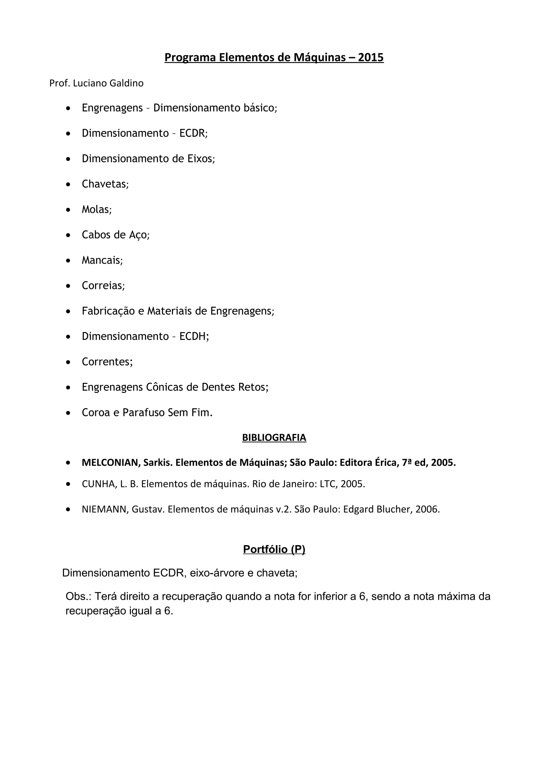 Este documento apresenta o programa da disciplina Elementos de Máquinas do professor Luciano Galdino para 2015, abordando tópicos como engrenagens, eixos, molas, correias e outros. Inclui também detalhes sobre avaliações, cálculo de média e material de apoio disponível online.