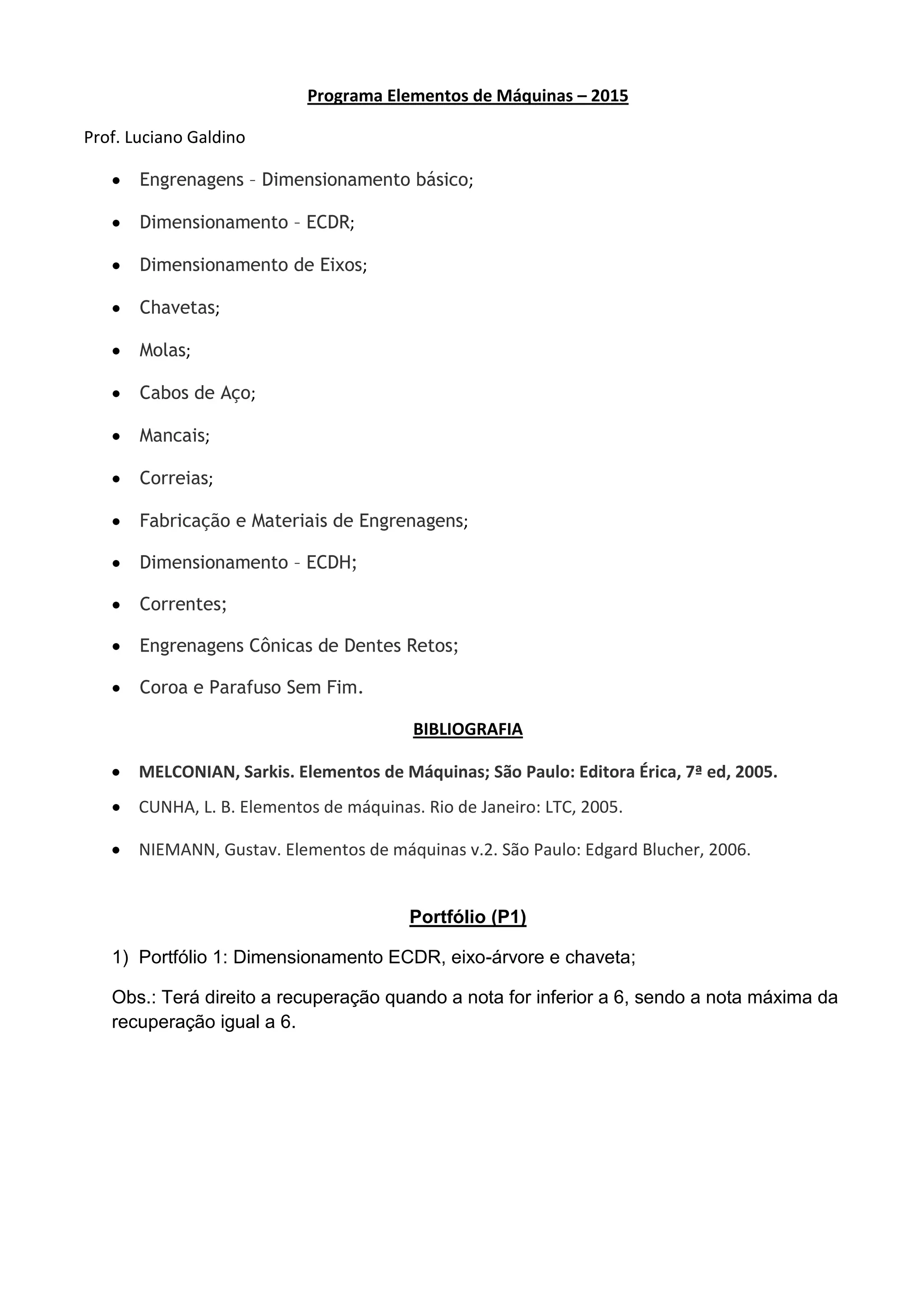 Este documento apresenta o programa do curso "Elementos de Máquinas - 2015" ministrado pelo professor Luciano Galdino. O curso abordará diversos tópicos relacionados a dimensionamento e fabricação de engrenagens e outros elementos de máquinas, avaliando os alunos por meio de portfólios, aulas ativas, dissertações e provas eletrônicas. O material de apoio estará disponível no blog do professor.