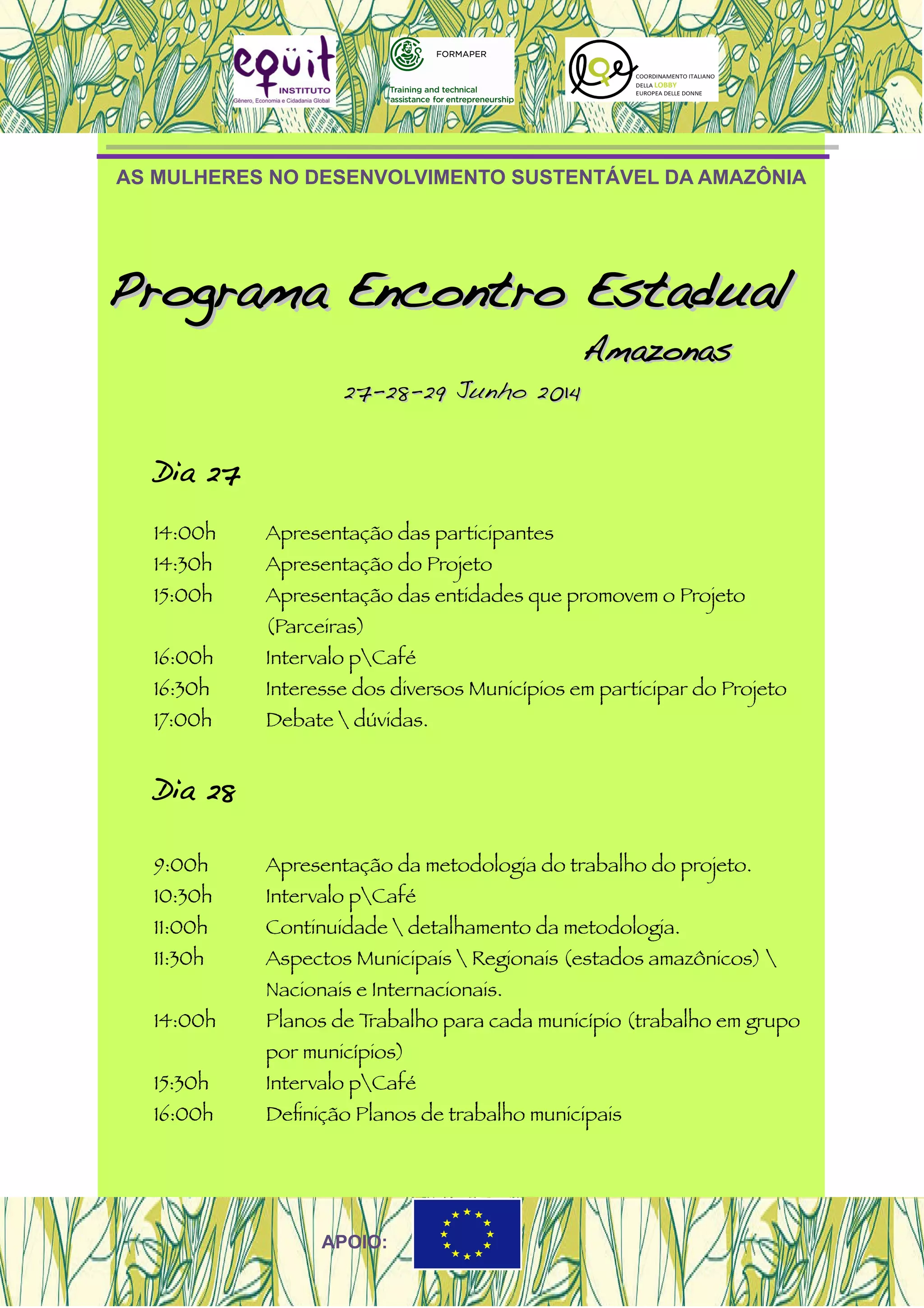 O documento descreve a programação de um encontro estadual sobre as mulheres no desenvolvimento sustentável da Amazônia, ocorrendo em Manaus entre os dias 27 a 29 de junho de 2014. A programação inclui apresentações sobre o projeto, entidades parceiras, metodologia de trabalho, planos de trabalho municipais e próximos passos do projeto.