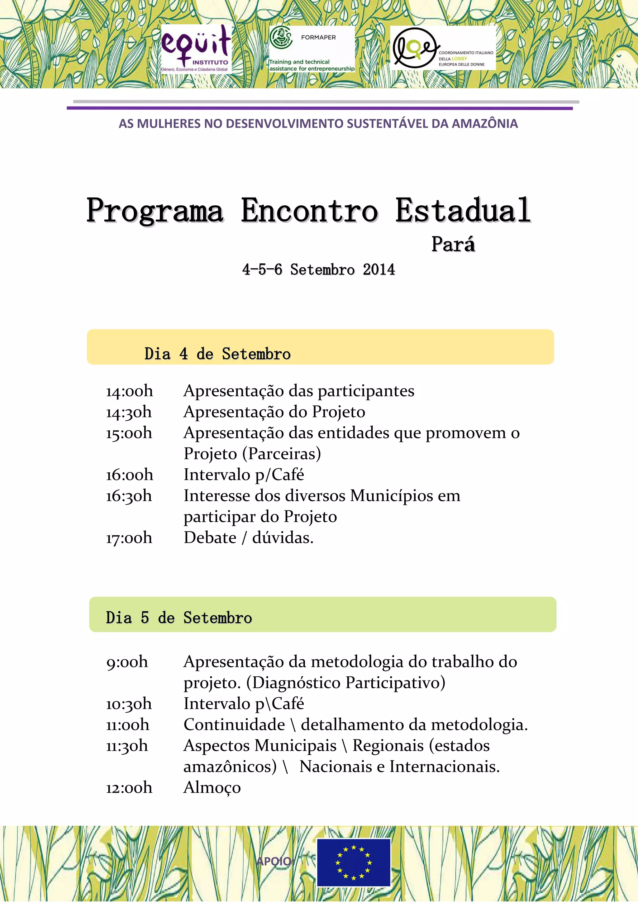 O documento descreve a agenda de um programa de três dias sobre mulheres e desenvolvimento sustentável na Amazônia no Pará. O programa inclui apresentações sobre o projeto, entidades parceiras, metodologia, planos de trabalho municipais e próximos passos.