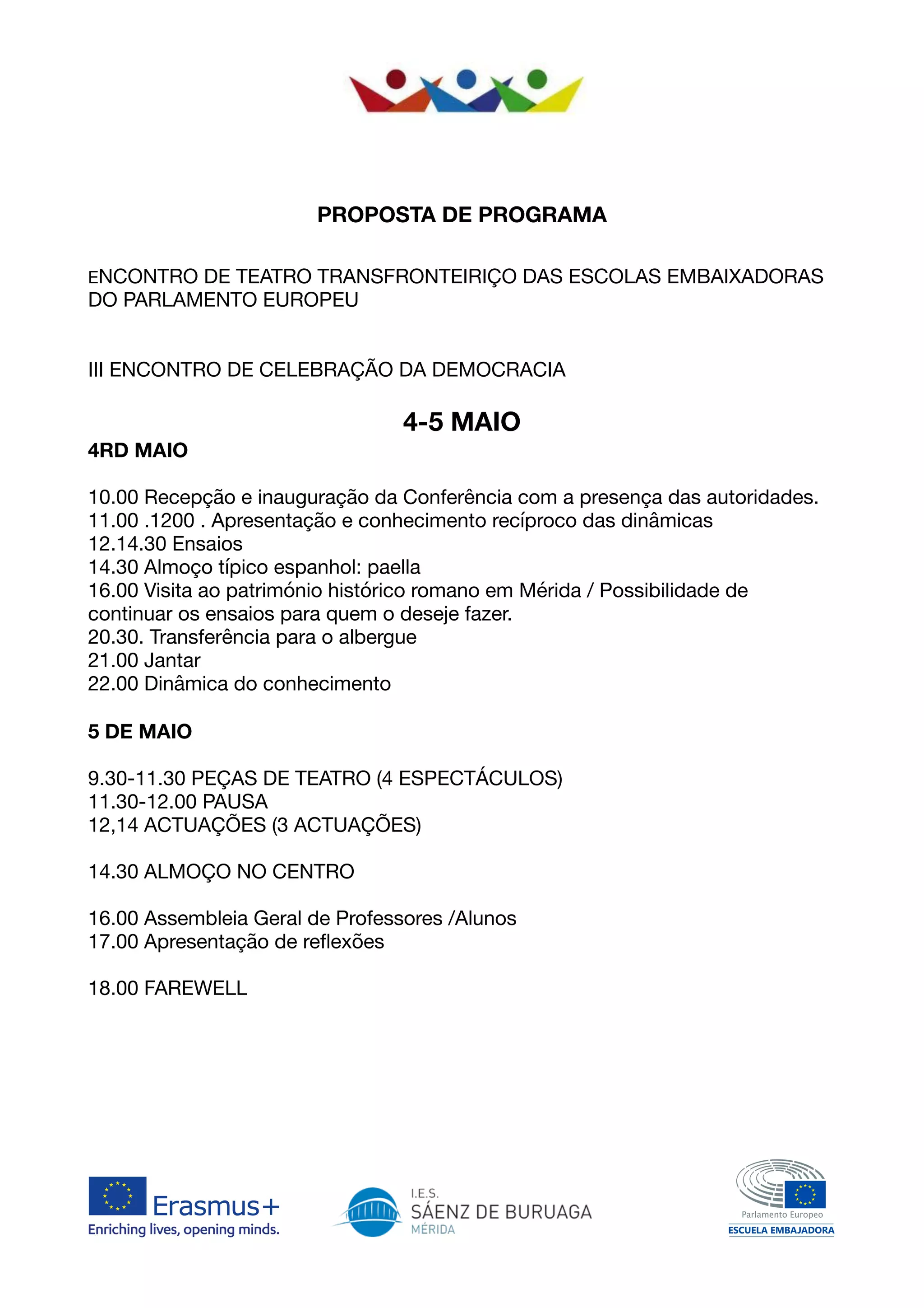 O documento descreve o programa de um encontro de teatro transfronteiriço entre escolas embaixadoras do Parlamento Europeu para celebrar a democracia. O programa inclui apresentações, ensaios, visitas culturais, jantares e apresentações de peças de teatro no dia 4 de maio, seguido por mais apresentações e uma assembleia geral de refl exão no dia 5 de maio.