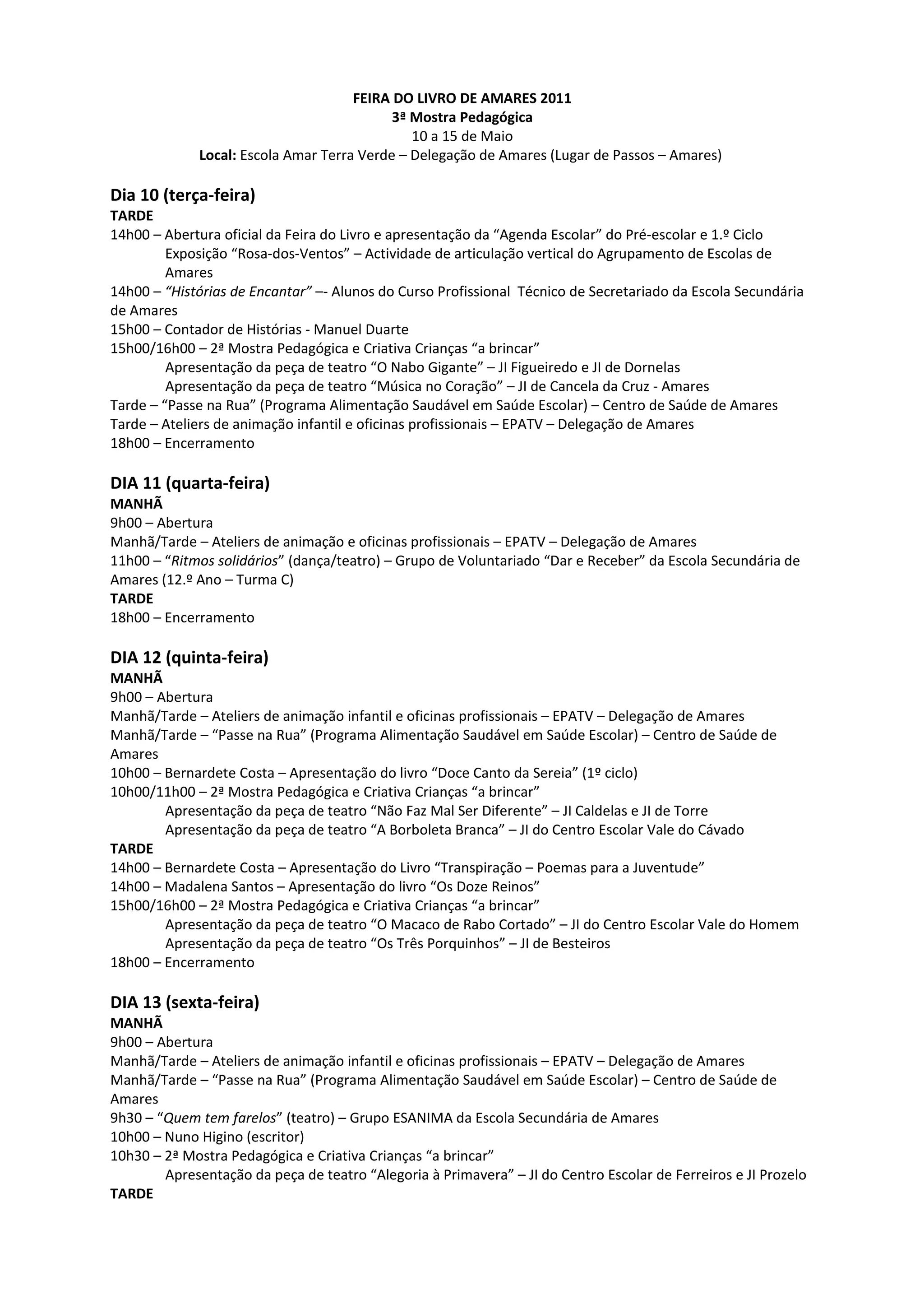 Este documento descreve o programa da Feira do Livro de Amares de 2011, que ocorreu de 10 a 15 de maio. O programa incluiu apresentações de livros, peças de teatro infantil, oficinas, contadores de histórias e shows musicais.