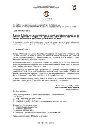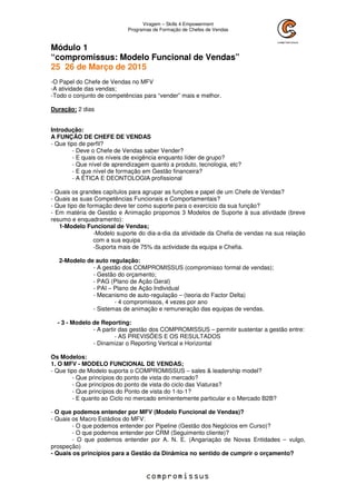 O documento descreve programas de formação para chefes de vendas. Apresenta três modelos para apoiar a atividade dos chefes de vendas: 1) Modelo Funcional de Vendas, 2) Modelo de Regulação e Liderança, 3) Modelo de Reporting. O objetivo é formar conceitos e ferramentas para que os chefes de vendas lidem de forma eficaz com as suas equipas e alcancem os objetivos de vendas.