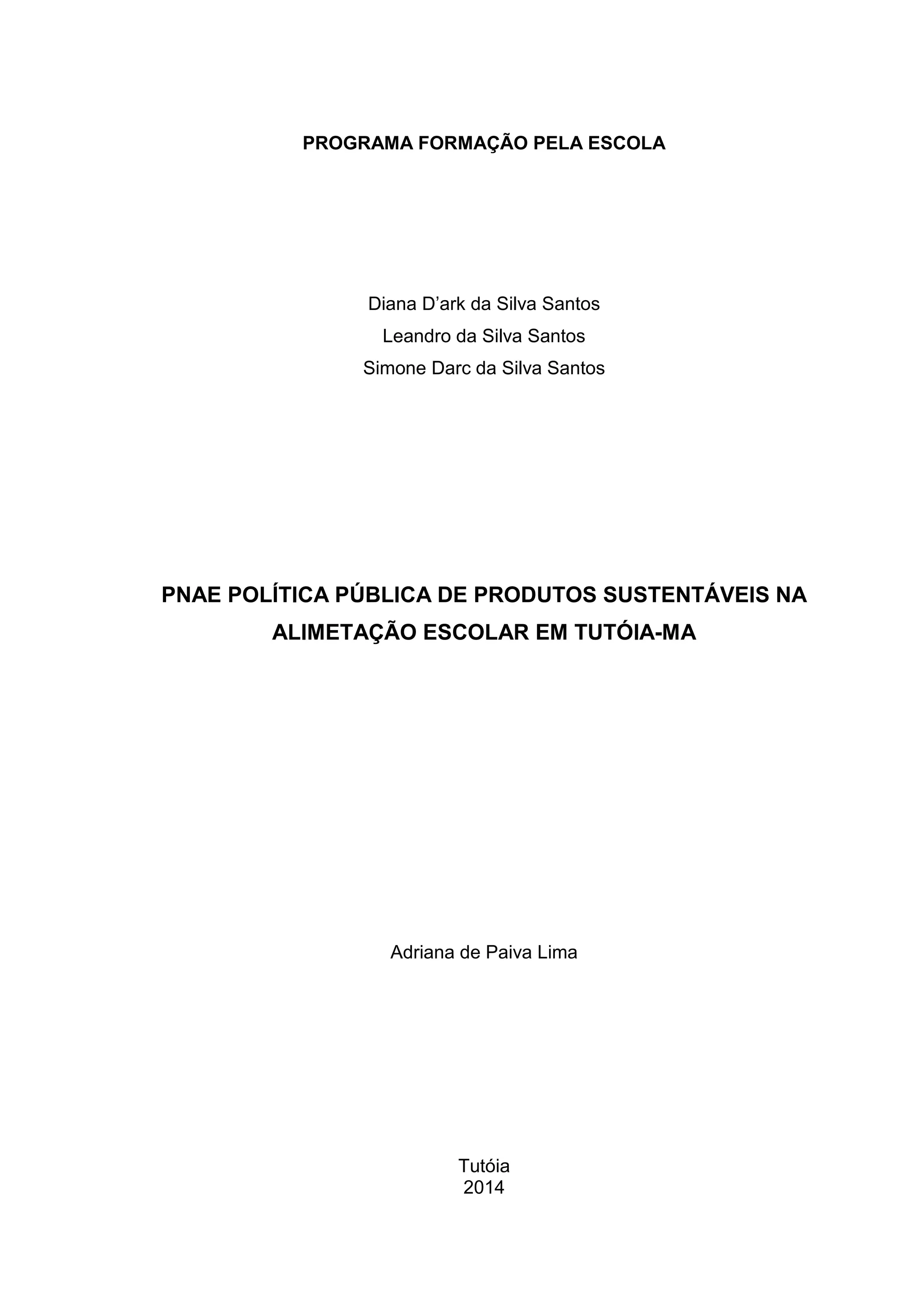 1. O documento discute o Programa Nacional de Alimentação Escolar (PNAE) em Tutóia, Maranhão, analisando seu papel como política pública de produtos sustentáveis na alimentação escolar.