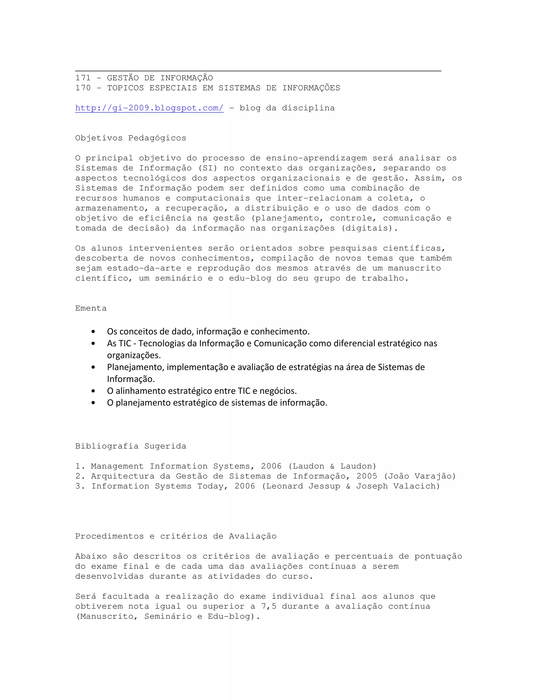 Este documento descreve os objetivos e conteúdo de uma disciplina sobre Gestão de Informação. O objetivo principal é analisar os Sistemas de Informação separando os aspectos tecnológicos dos aspectos organizacionais e de gestão. Os alunos serão orientados sobre pesquisas científicas e a compilação de novos temas. A avaliação inclui um exame final, um manuscrito, um seminário e contribuições para um blog educacional.