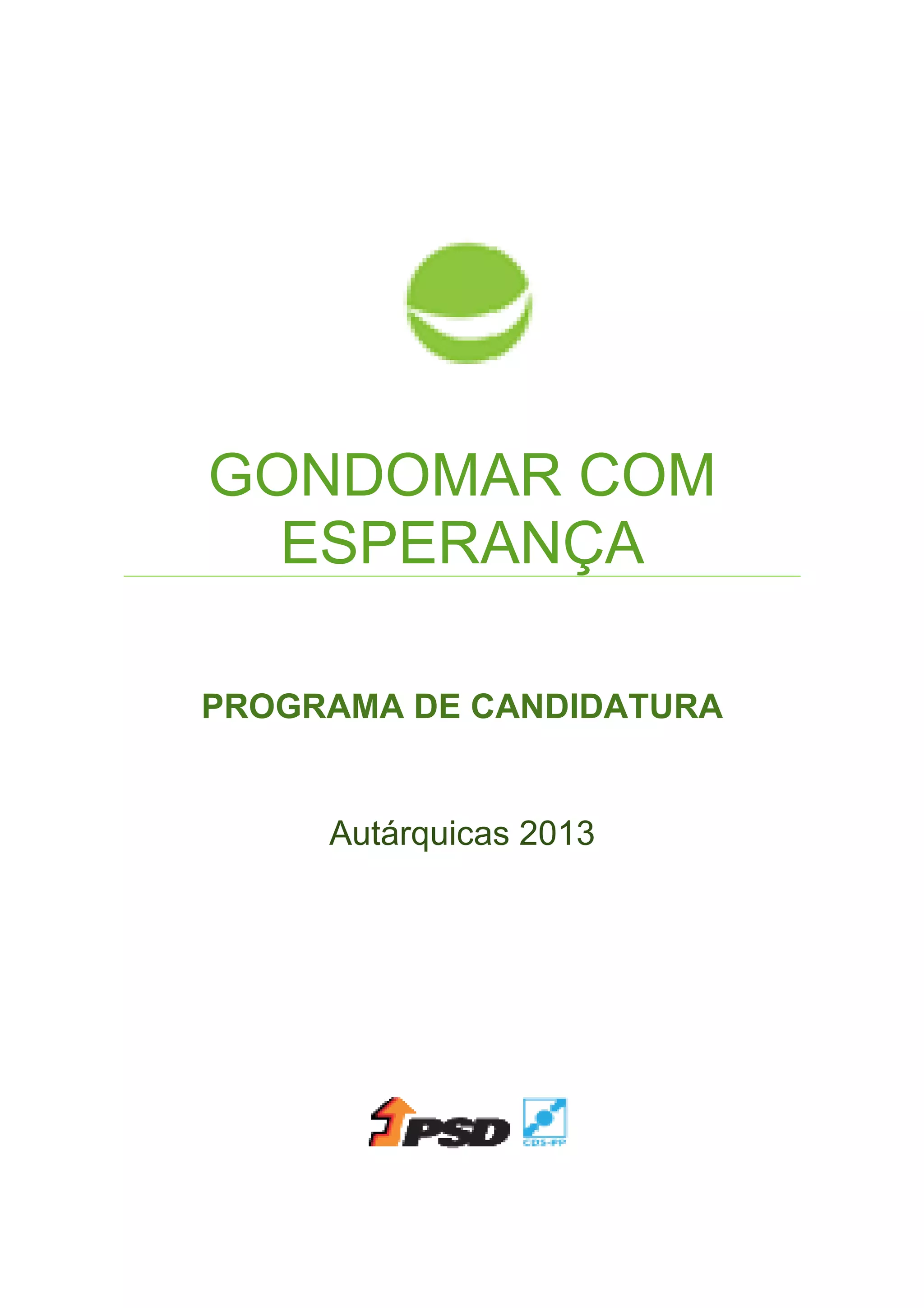 Este documento apresenta o programa de candidatura às eleições autárquicas de 2013 do partido "Gondomar com Esperança". O programa destaca áreas prioritárias de intervenção como a intervenção social, a economia local e o desenvolvimento económico. O objetivo é promover o desenvolvimento sustentado do concelho através da melhoria dos serviços sociais e da consolidação da economia local.