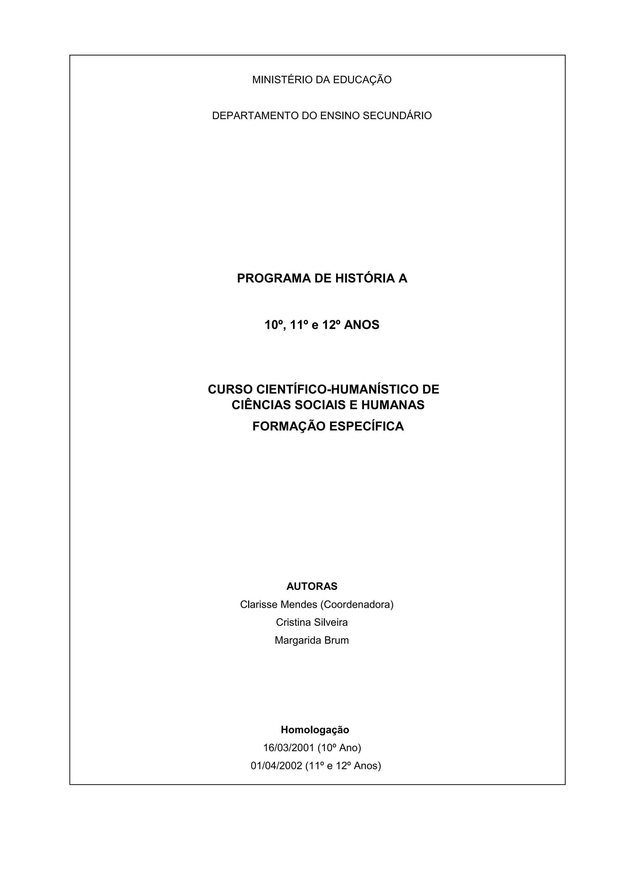 Este documento apresenta o programa de História para o 10o, 11o e 12o anos do Curso Científico-Humanístico de Ciências Sociais e Humanas. O programa define as finalidades, objetivos, competências e conteúdos a serem desenvolvidos ao longo dos três anos letivos, organizados em módulos temáticos, com ênfase na análise crítica de fontes e na interpretação do passado e do presente.