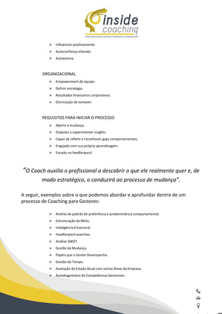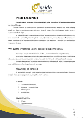 O programa Inside Leadership oferece coaching para diretores, gestores e executivos melhorarem suas habilidades de liderança através de sessões semanais de 1 a 1,5 horas por 6 meses a 1 ano. O coaching aborda tópicos como inteligência emocional, gestão de equipe e mudança, visando resultados pessoais, comportamentais e organizacionais.