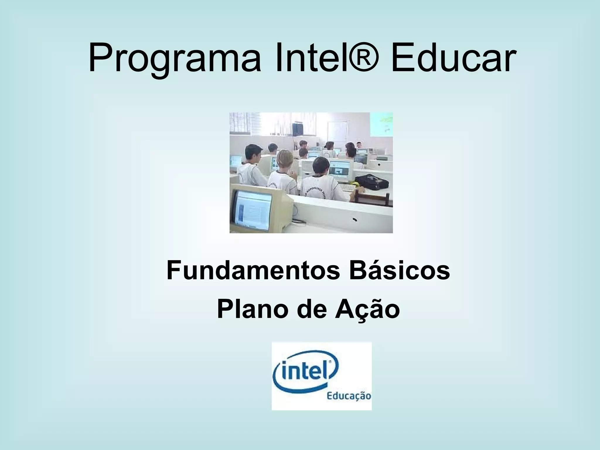 O documento descreve o programa Intel® Educar Fundamentos Básicos, que tem como objetivo auxiliar professores a adquirir habilidades tecnológicas básicas e introduzi-los a abordagens pedagógicas do século XXI. O programa consiste em 12 módulos que abordam temas como ambientes de aprendizagem colaborativos e centrados no aluno, além de habilidades como raciocínio crítico, produtividade e uso eficaz de tecnologia.