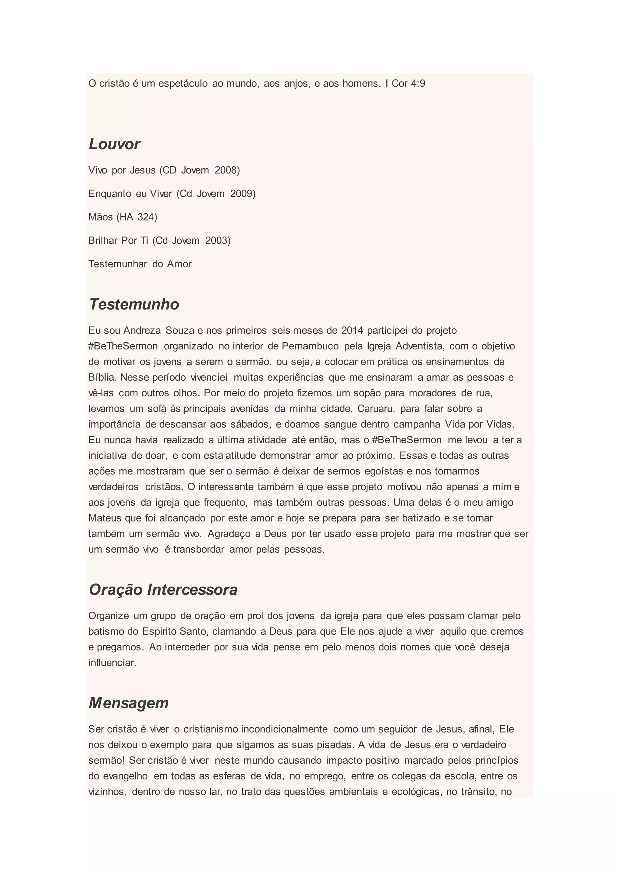 O documento discute a importância de viver como um "sermão vivo", transmitindo os ensinamentos de Jesus através de ações e do próprio exemplo de vida. Ele inclui uma oração, uma mensagem, e exemplos de como jovens participaram de projetos sociais transmitindo amor ao próximo. O objetivo é motivar os jovens a viverem os princípios cristãos e serem uma influência positiva para os outros.