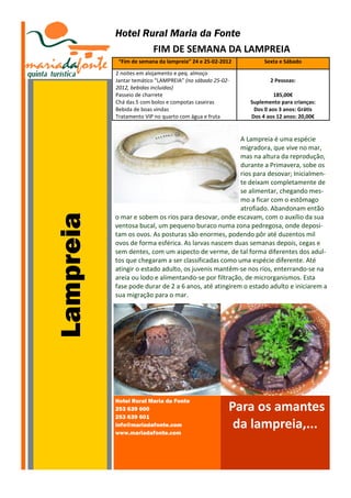O documento anuncia um fim de semana temático sobre lampreia no Hotel Rural Maria da Fonte, oferecendo duas noites de alojamento, refeições incluindo um jantar de lampreia, passeio de charrete e tratamento VIP no quarto por 185€ por casal. Também fornece informações biológicas sobre o ciclo de vida da lampreia, desde a desova nos rios até a migração para o mar na fase adulta.