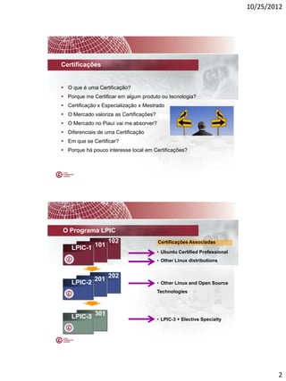 O documento discute certificações em tecnologia da informação, especificamente o programa LPIC (Linux Professional Institute Certification). O LPIC oferece três níveis de certificação focados em fundamentos, nível avançado e especializações em Linux. O documento explica os requisitos e benefícios de cada nível de certificação LPIC.