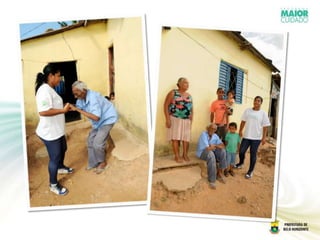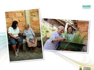 O documento descreve o Projeto Cuidador de Idosos em Belo Horizonte, que fornece apoio domiciliar e social para idosos frágeis. O projeto é uma parceria entre a Secretaria Municipal de Saúde e a Secretaria Municipal de Assistência Social. Ele avalia os idosos, fornece cuidadores treinados, e tem como objetivo manter a independência dos idosos e fortalecer as famílias. Os resultados têm mostrado benefícios como melhor qualidade de vida e acesso a serviços.