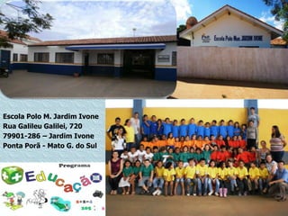 O documento descreve o programa Mais Educação implementado na Escola Polo Municipal Jardim Ivone em Ponta Porã, MS. O programa oferece atividades extrascurriculares como leitura, matemática, capoeira, dança, música, fotografia, esportes e horta escolar para estudantes do 1o ao 3o ano para melhorar o ambiente escolar e desenvolvimento das crianças. O documento relata os benefícios do programa no aprendizado e crescimento dos alunos.