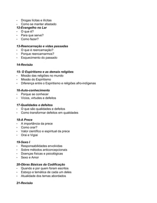 O programa de pré-mocidade aborda diversos temas espíritas ao longo de 68 aulas, incluindo amizade, influências externas, Espiritismo, preconceito, vícios, reencarnação, família, mediunidade, Deus, caridade, orações, relacionamentos, obsessão e desobsessão. O objetivo é preparar jovens com base nos princípios espíritas e ensinar sobre espiritualidade e responsabilidades sociais.