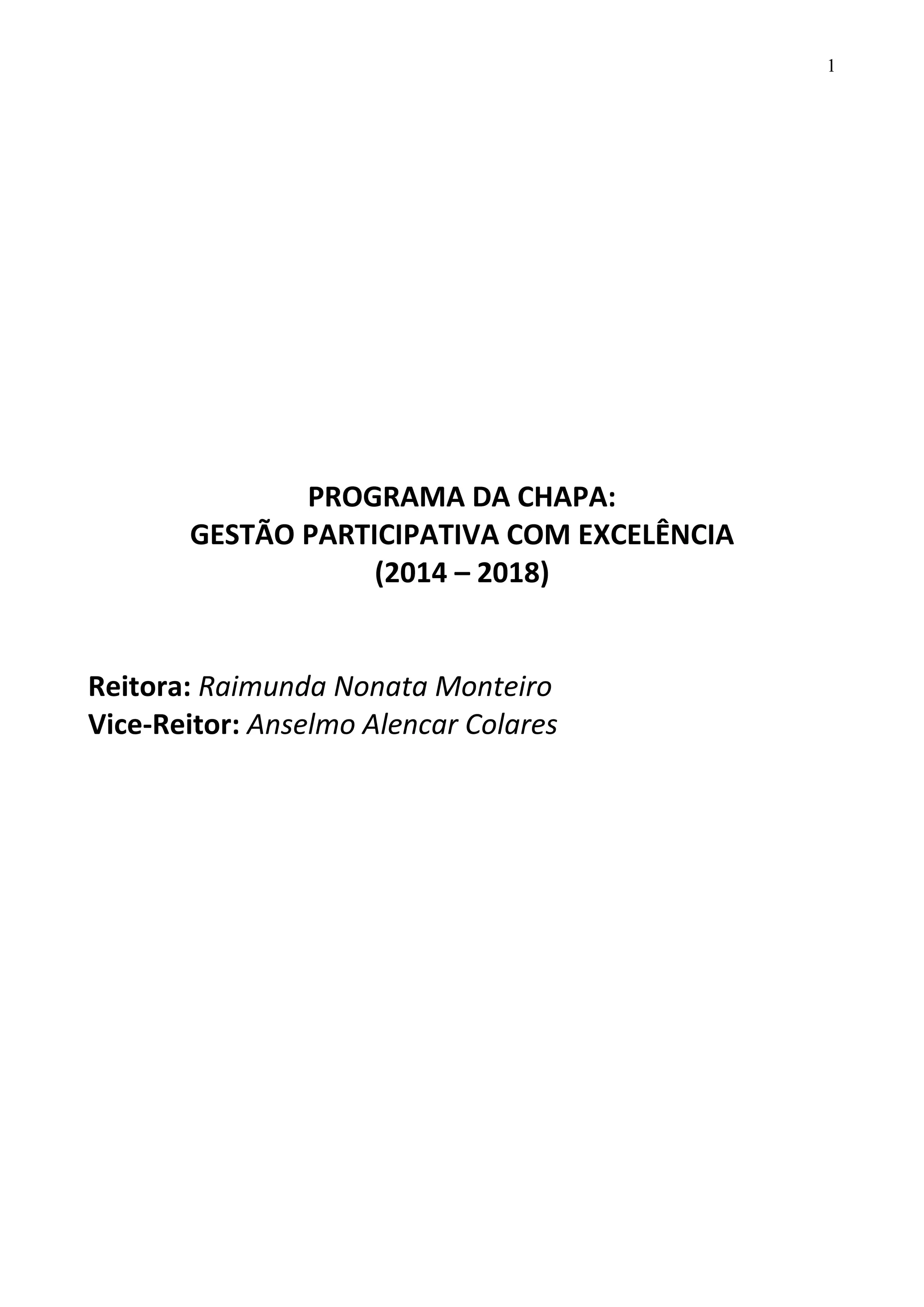 O documento apresenta o programa de gestão da chapa "Gestão Participativa com Excelência" para a Universidade Federal do Oeste do Pará (UFOPA) no período de 2014 a 2018. O programa propõe uma gestão democrática e transparente com foco na qualidade do ensino, pesquisa e extensão. Entre as propostas, destacam-se a descentralização orçamentária, melhoria da infraestrutura física dos campi, e a valorização dos docentes e técnicos administrativos. O objetivo é consolidar a UFOPA como instituição pública