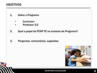 O documento fornece orientações sobre a implementação do Programa Novas Tecnologias - Novas Possibilidades da Secretaria da Educação. O programa visa aprimorar o ensino e a aprendizagem por meio de ferramentas e recursos tecnológicos. Dois projetos lançados são o Currículo+, que disponibiliza conteúdos digitais, e o Professor 2.0, ambiente colaborativo online. O papel do Professor Coordenador de Tecnologia Educacional é divulgar e apoiar a implementação das iniciativas nas escol