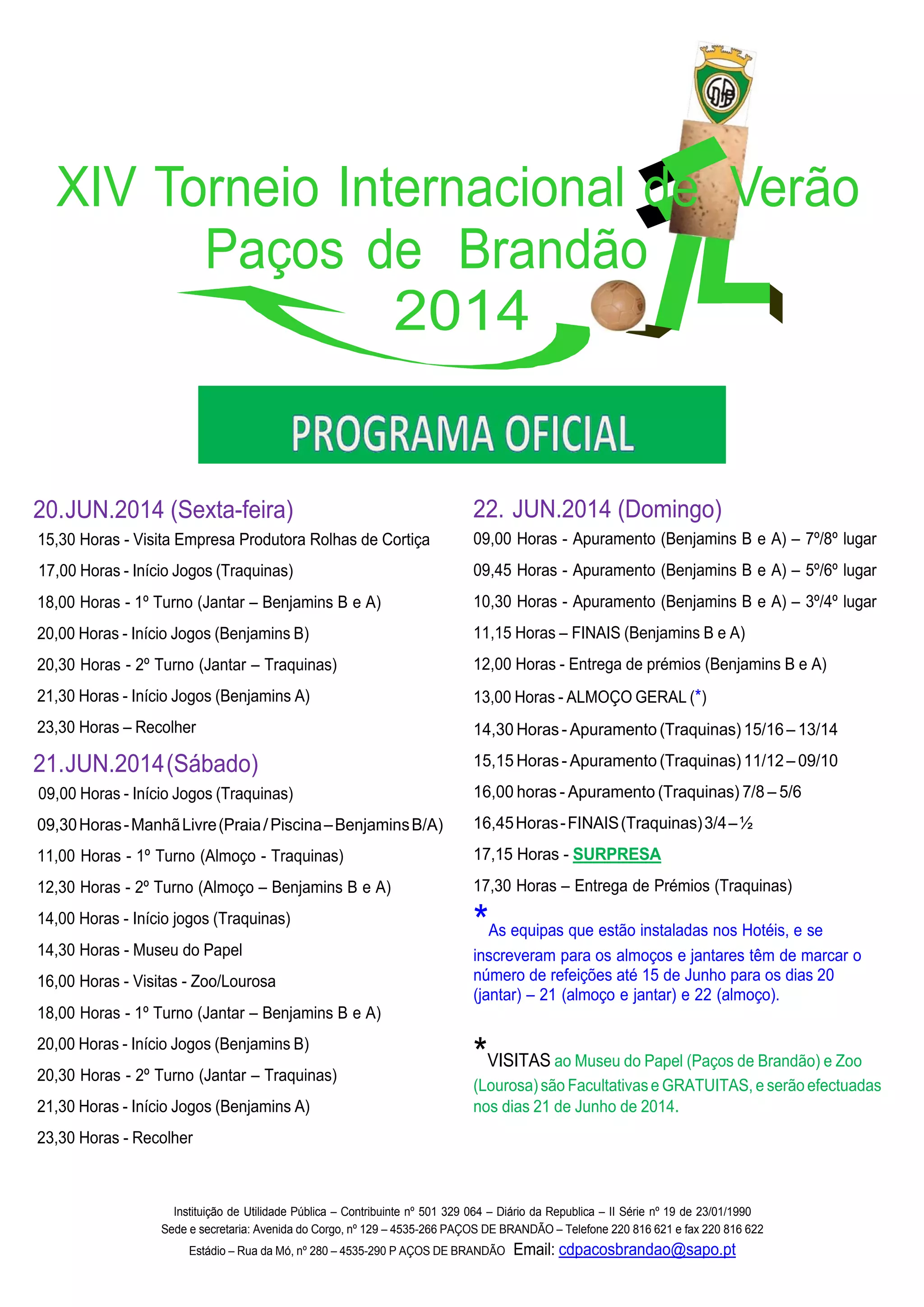 O documento descreve o programa detalhado do XIV Torneio Internacional de Verão que será realizado em Paços de Brandão em 2014, incluindo as atividades planejadas para cada dia do evento de 20 a 22 de junho, como jogos de futebol, refeições, visitas a empresas e museus. O torneio é dividido em categorias como Traquinas, Benjamins B e A, com jogos de apuramento e finais.