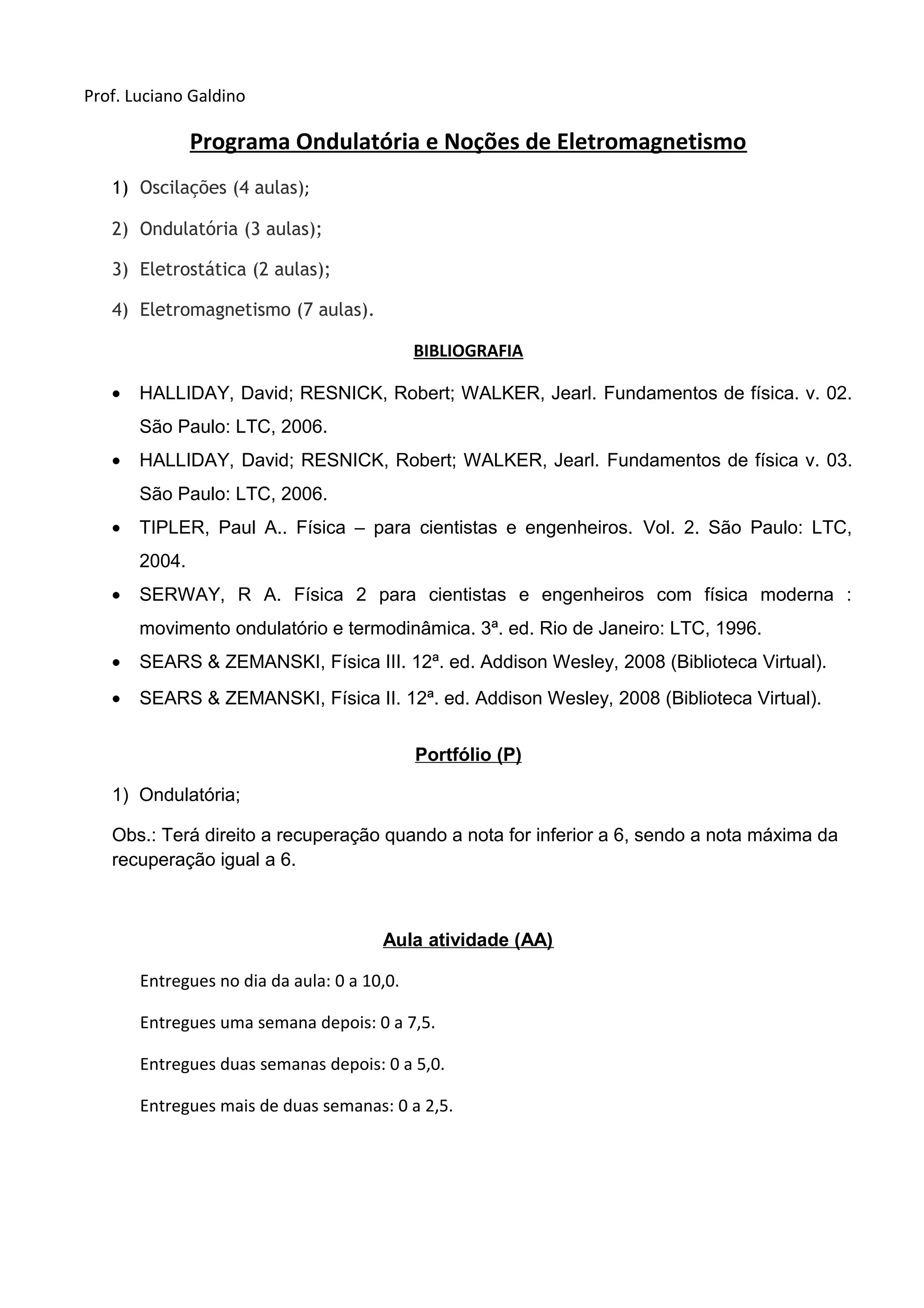 O programa aborda oscilações, ondulatória e eletromagnetismo ao longo de 16 aulas. O conteúdo inclui oscilações, ondulatória, eletrostática e eletromagnetismo. A avaliação é composta por portfólio, aulas atividade, avaliação dissertativa e prova eletrônica. A média final é calculada com base nos pesos destas atividades.