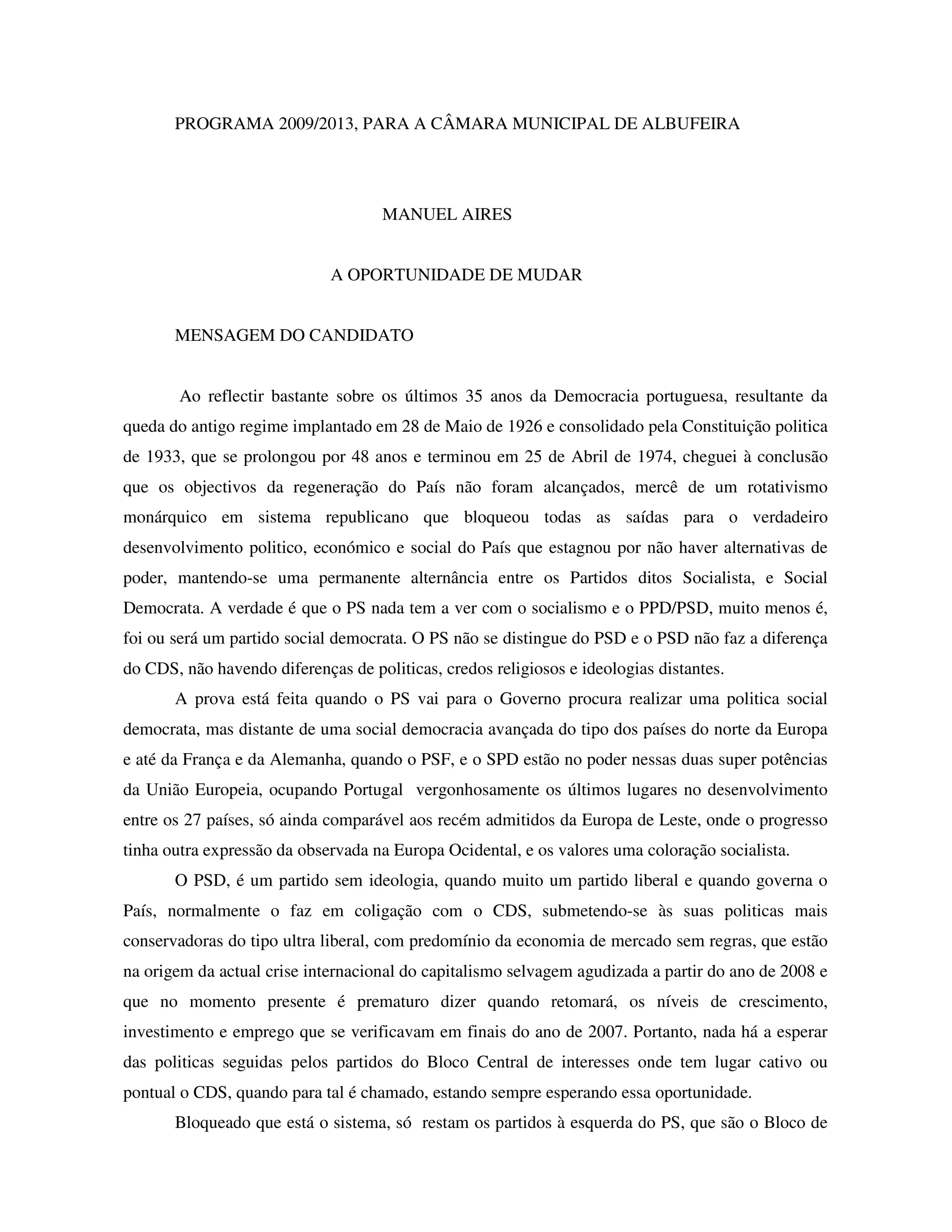 1) O documento apresenta o programa político de Manuel Aires para a Câmara Municipal de Albufeira entre 2009-2013. Ele critica o bloqueio do sistema político português pelos mesmos dois partidos e propõe alternativas de esquerda.