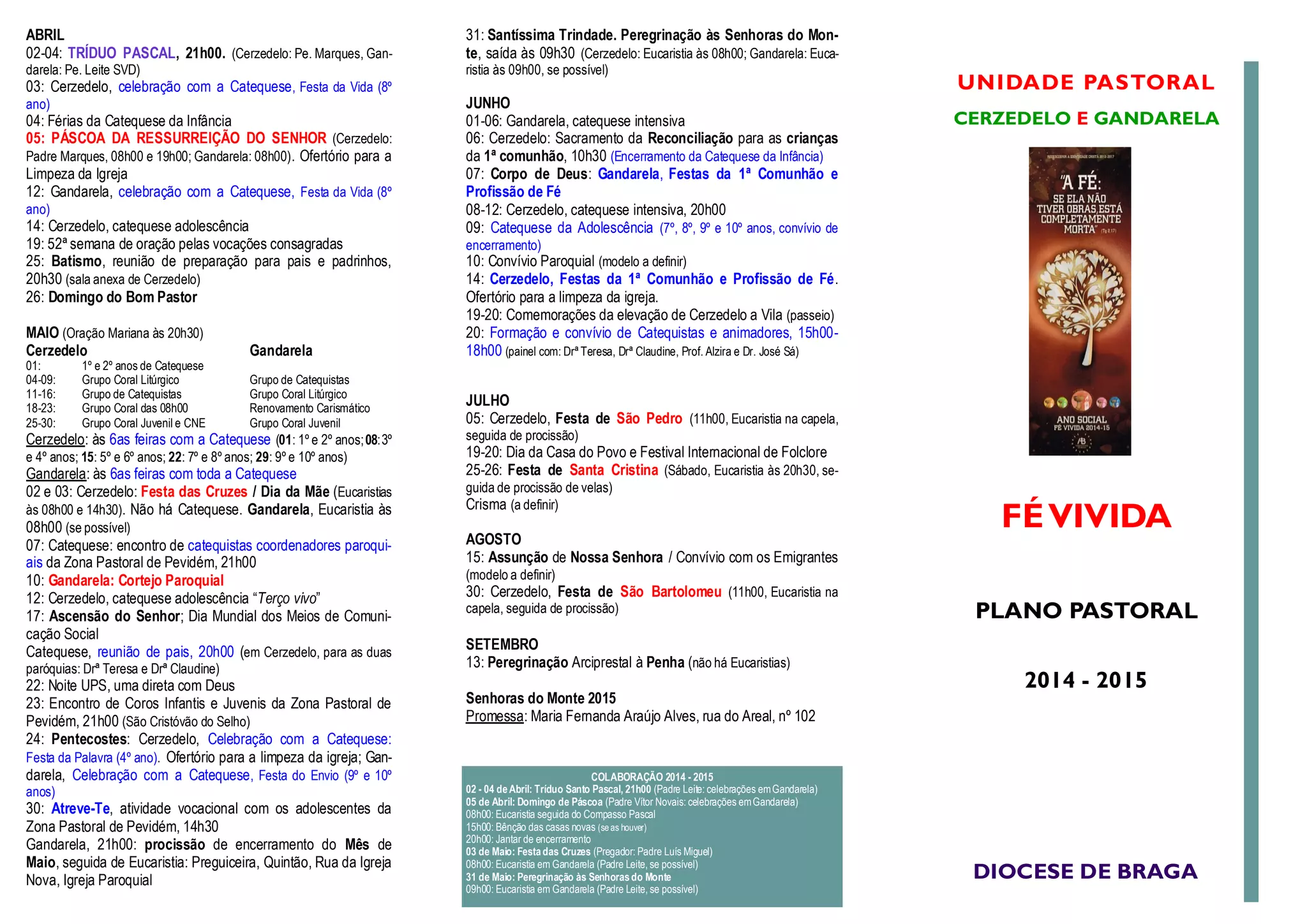 Este documento apresenta o plano pastoral para 2014-2015 das unidades pastorais de Cerzedelo e Gandarela. Inclui o calendário de eventos litúrgicos e catequéticos como o Tríduo Pascal, festas marianas, catequese semanal e reuniões de preparação para sacramentos. Também lista a colaboração de padres em celebrações e atividades como a Páscoa, festas marianas e catequese.