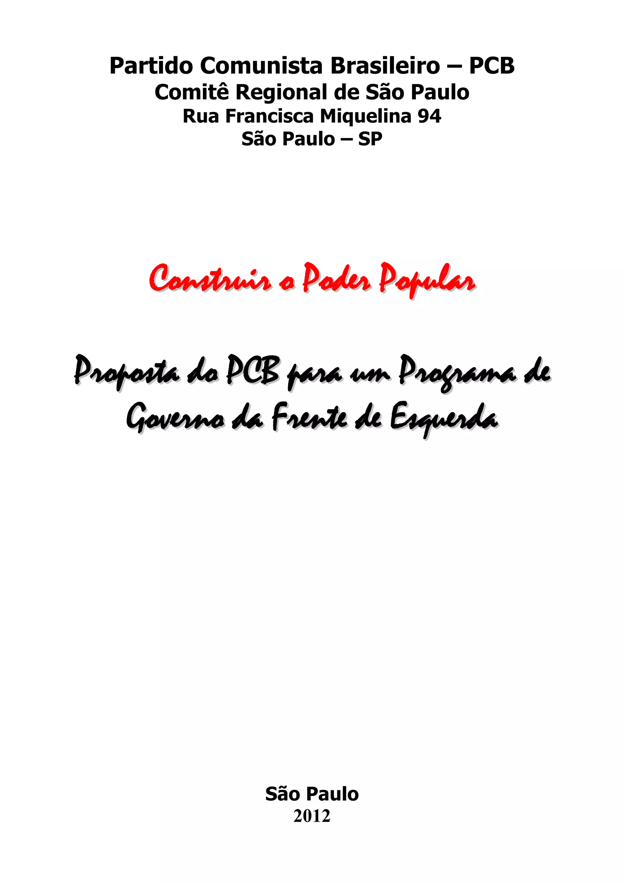 Este documento apresenta uma proposta do Partido Comunista Brasileiro (PCB) para um programa de governo de esquerda na cidade de São Paulo, com foco na construção do poder popular através de conselhos populares eleitos que teriam poder de decisão sobre o orçamento e gestão dos serviços públicos municipais. O objetivo é inverter a lógica atual que beneficia o capital e promover uma cidade gerida democraticamente pelos cidadãos.